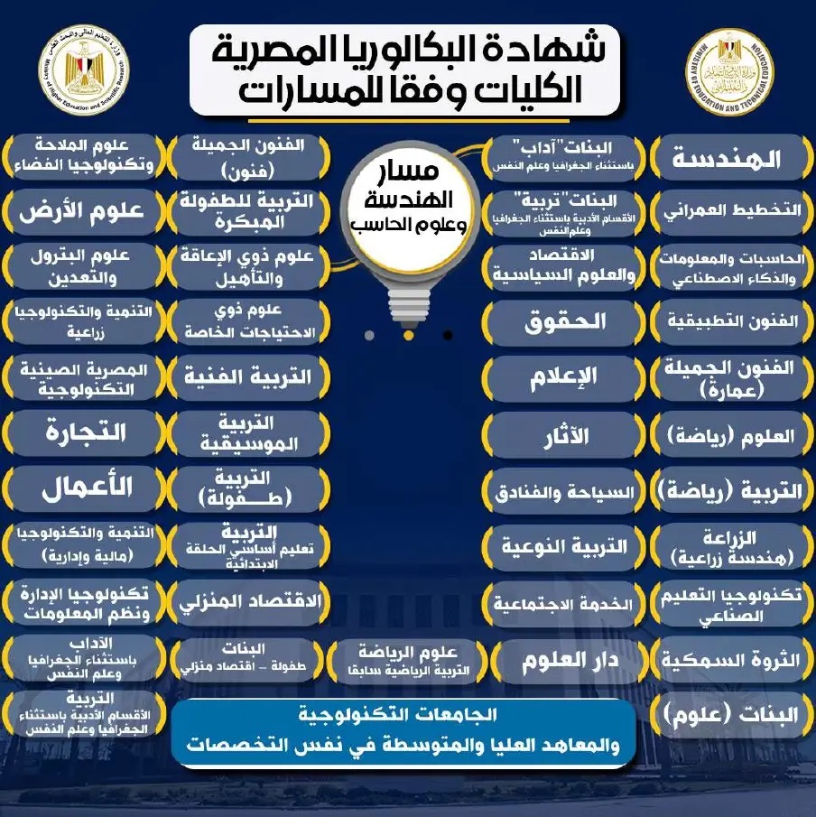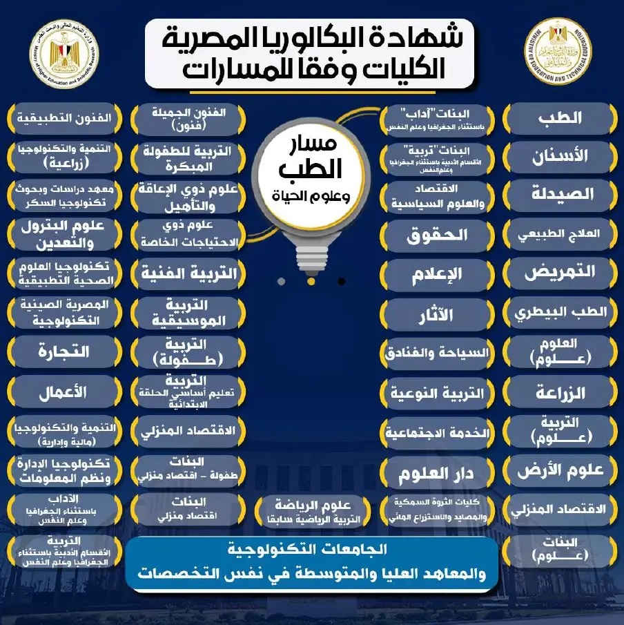 أوضحت الوزارتان أن لكل مسار أكاديمي في نظام البكالوريا مجموعة من الكليات والتخصصات الجامعية التي يمكن للطالب التقدم لها عبر التنسيق، وقد تم إعداد هذه القوائم بما يضمن العدالة مع طلاب الثانوية العامة التقليدية. وتأتي أبرز التخصصات الجامعية المرتبطة بكل مسار على النحو التالي: