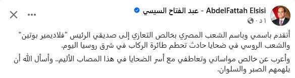 وقال الرئيس السيسي، في منشور له على صفحته الرسمية على مواقع التواصل الاجتماعي، "أتقدم باسمي وباسم الشعب المصري بخالص التعازي إلى صديقي الرئيس "فلاديمير بوتين" والشعب الروسي في ضحايا حادث تحطم طائرة الركاب في شرق روسيا اليوم".