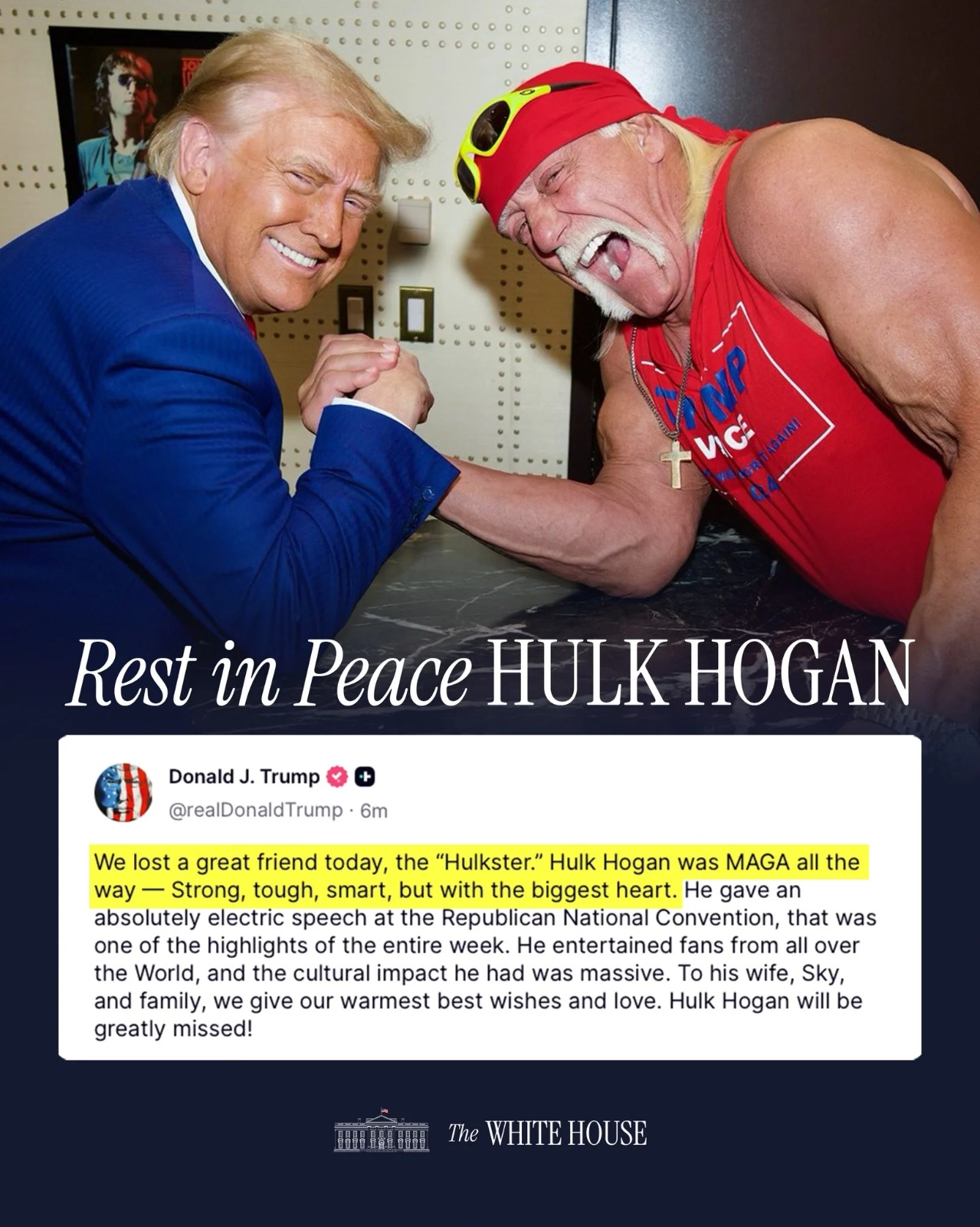 وأكد ترامب "ألقى هوجان خطابًا مؤثرًا للغاية في المؤتمر الوطني للحزب الجمهوري، والذي كان من أبرز أحداث الأسبوع. أمتع جمهوره من جميع أنحاء العالم، وكان تأثيره الثقافي هائلًا. نتقدم إلى زوجته سكىي وعائلته بأصدق المواساة. سنفتقد هولك هوجان كثيرًا!".