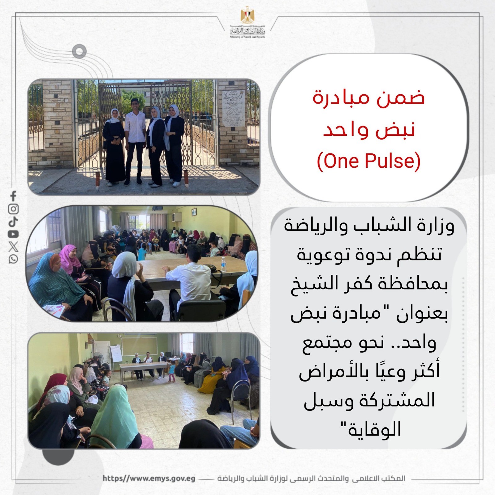 في إطار جهود مبادرة "نبض واحد"، نظمت وزارة الشباب والرياضة، ممثلة في الإدارة المركزية لتمكين الشباب – الإدارة العامة للمبادرات الشبابية، وضمن الأنشطة الميدانية لمبادرة نبض واحد (One Pulse)، ندوة توعوية بمركز شباب "اصلاح شالما " بمحافظة كفر الشيخ، بهدف تعزيز الوعي المجتمعي بمفاهيم الصحة العامة والأمراض المشتركة بين الإنسان والحيوان.
