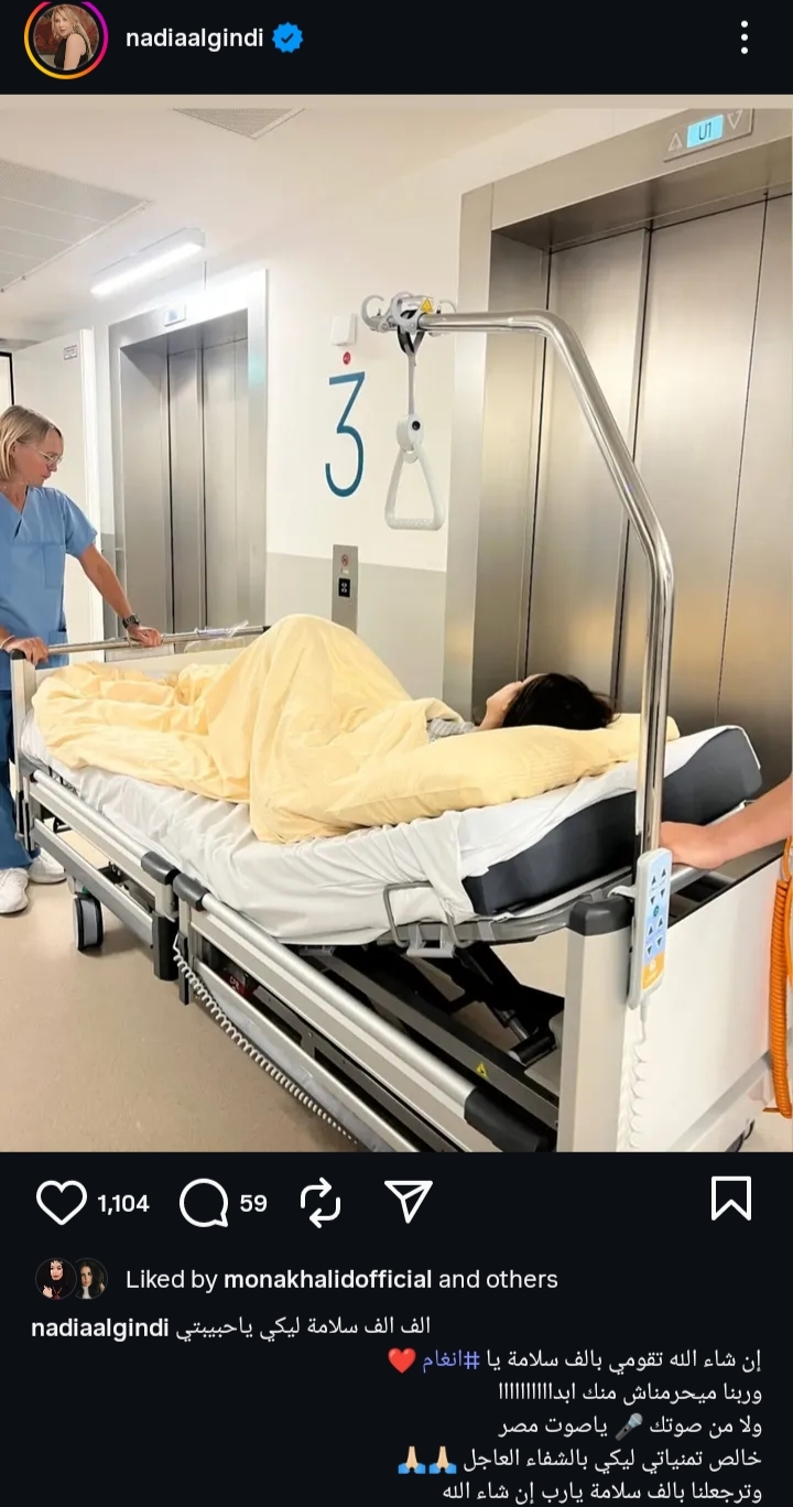 ونشرت نادية الجندي صورة لـ أنغام أثناء وجودها في المستشفى ووجهت لها رسالة متمنية لها الشفاء العاجل.