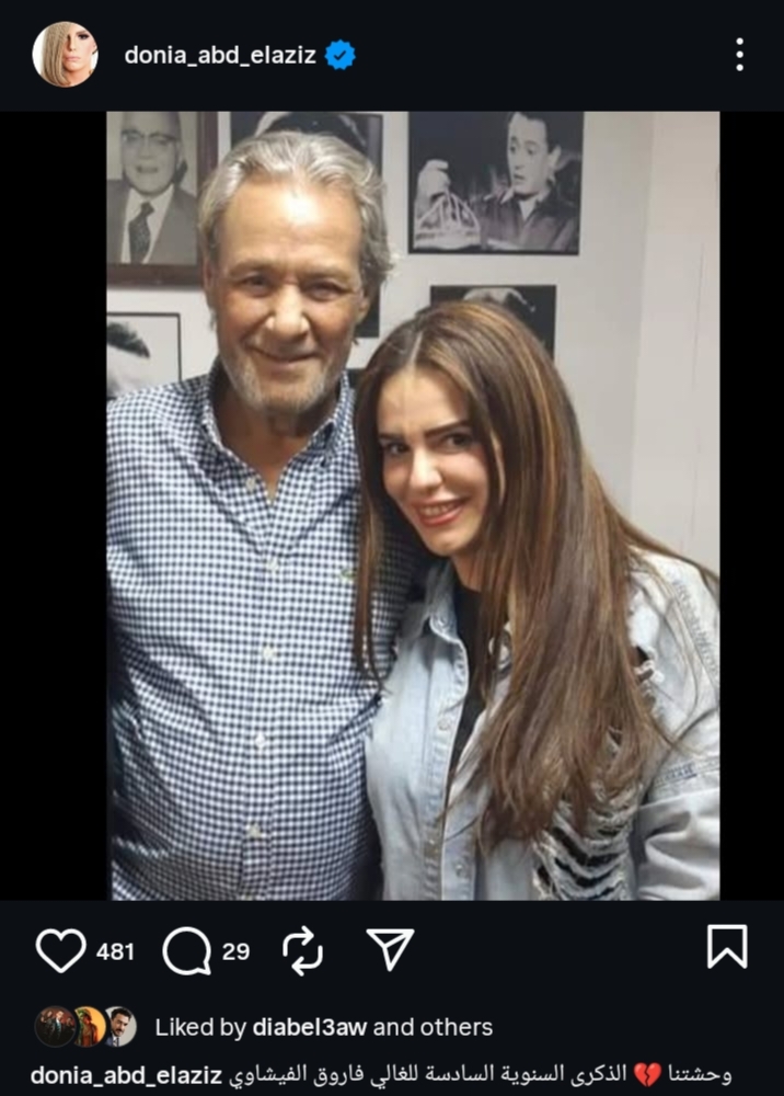 أحيت الفنانة دنيا عبد العزيز الذكرى السادسة لـ رحيل الفنان القدير فاروق الفيشاوي، الذي رحل عن عالمنا في مثل هذا اليوم الموافق 25 يوليو.