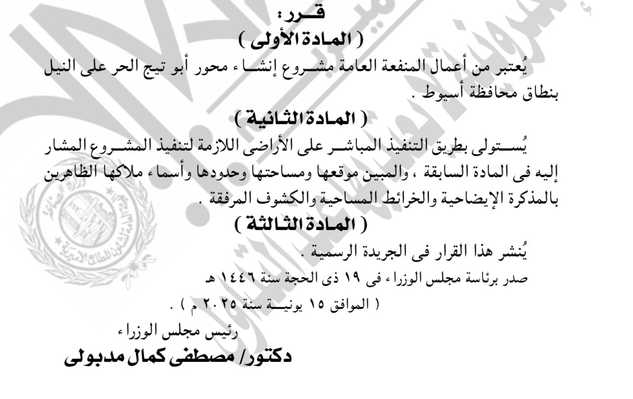 أصدر الدكتور مصطفى مدبولي، رئيس الوزراء، قرار باعتبار مشروع إنشاء محور أبو تيج الحر على النيل بأسيوط من أعمال المنفعة العامة .