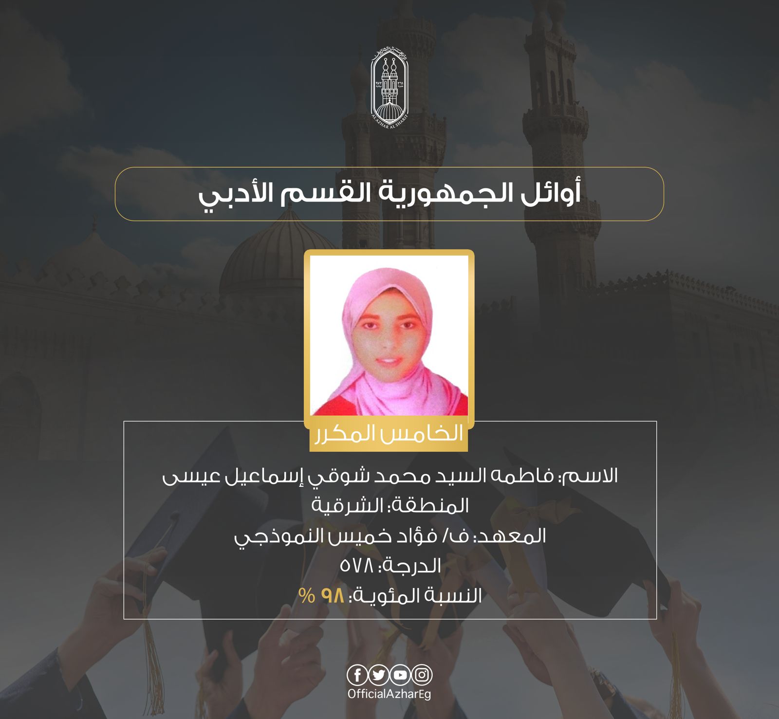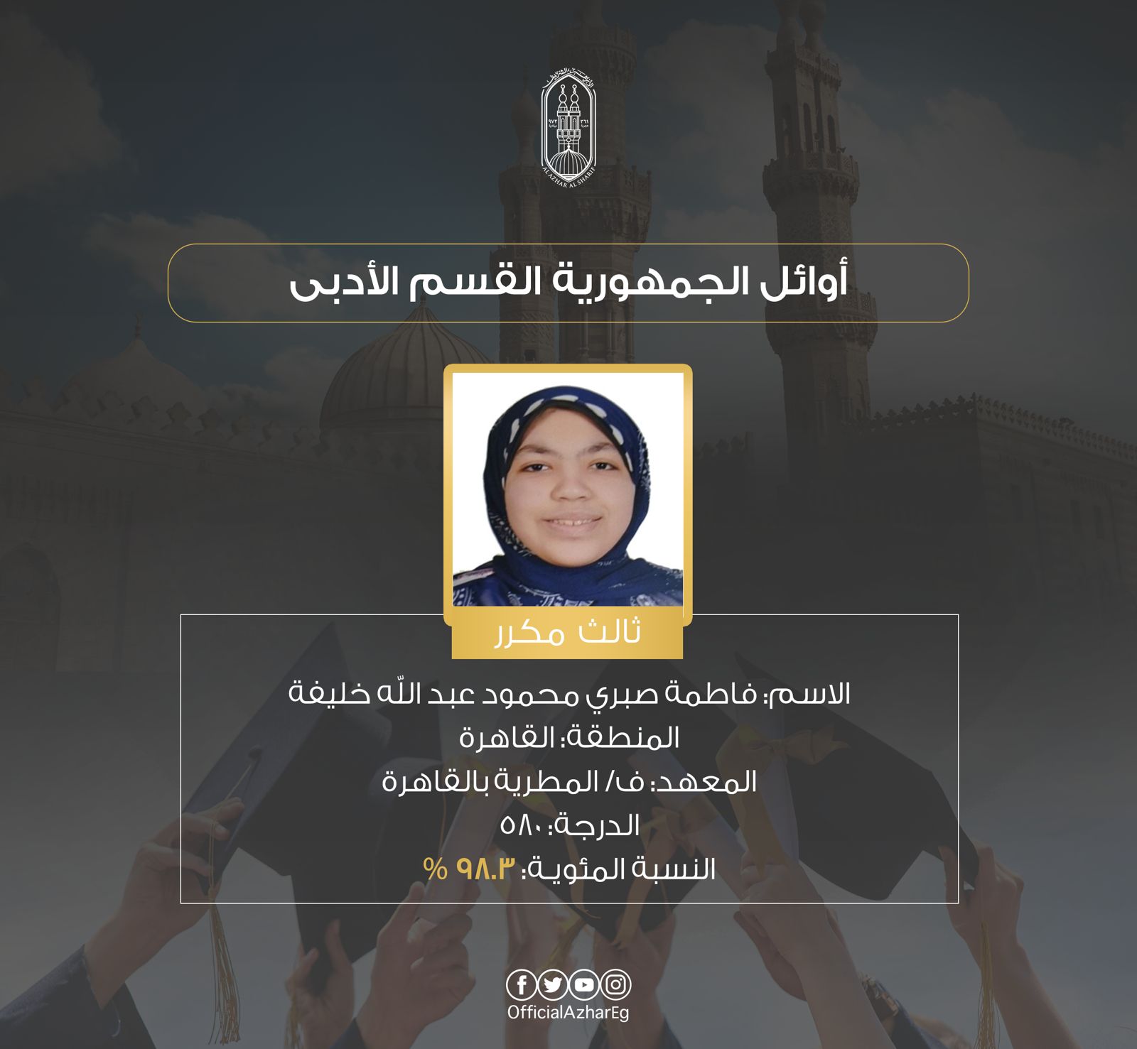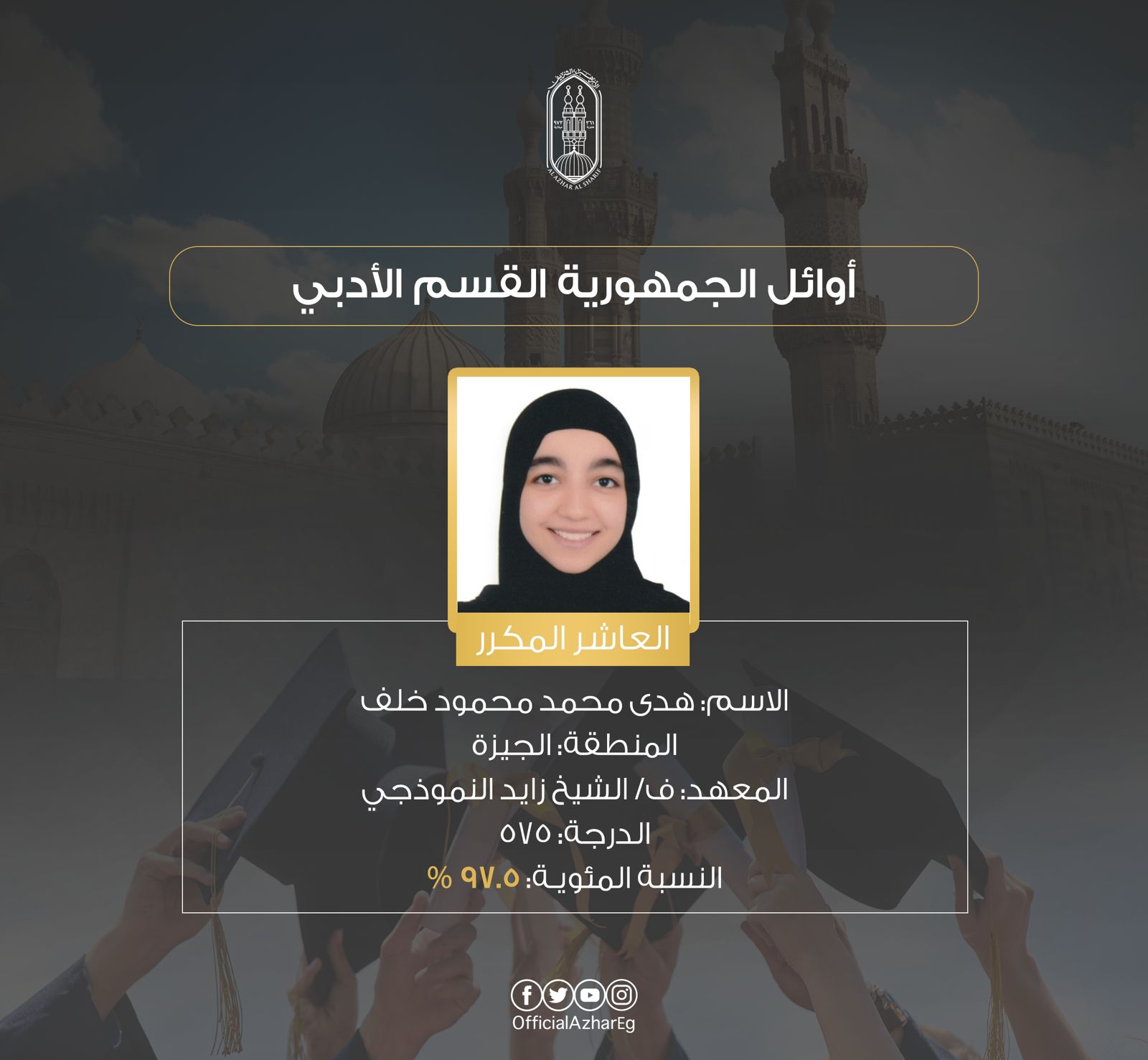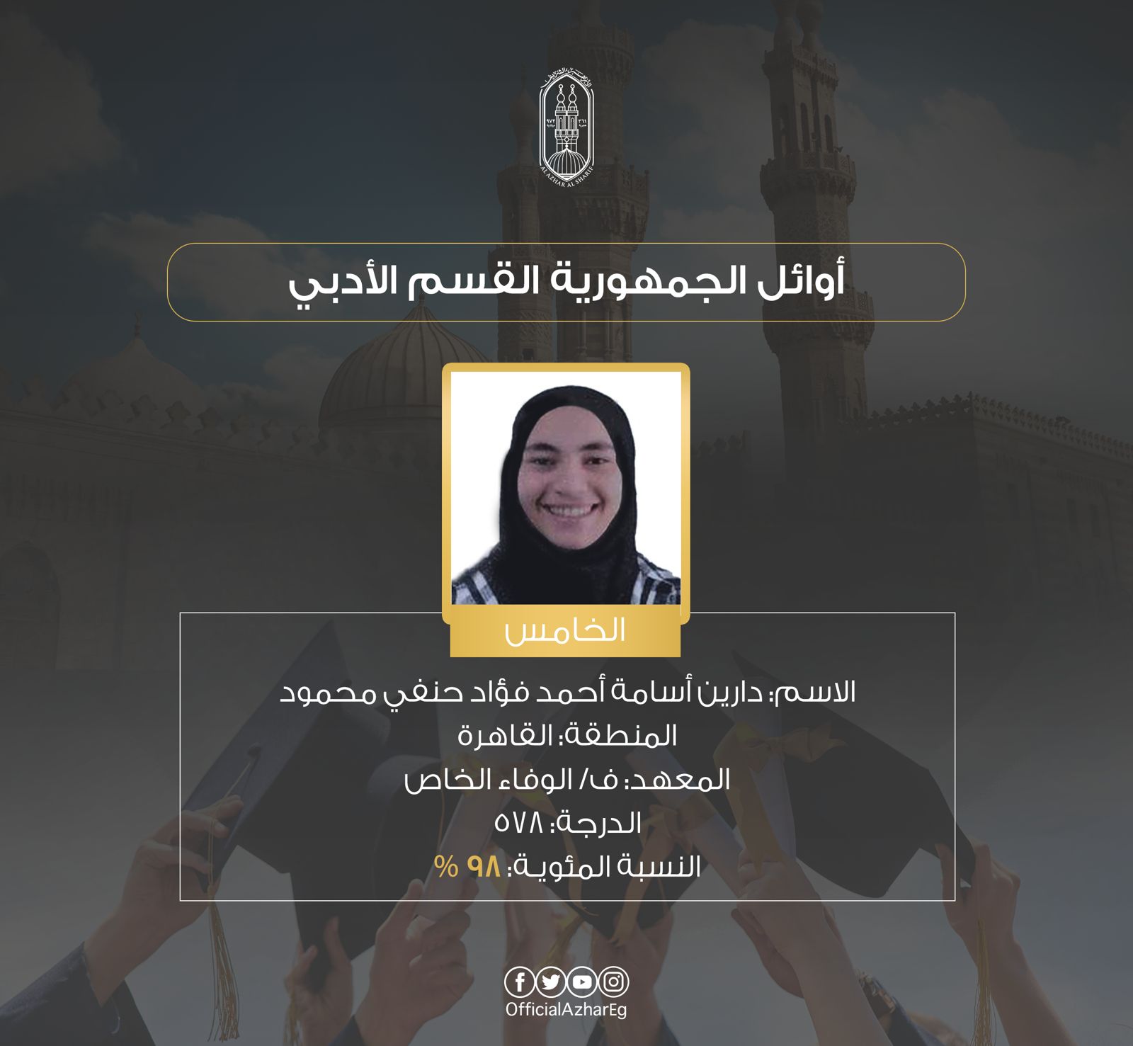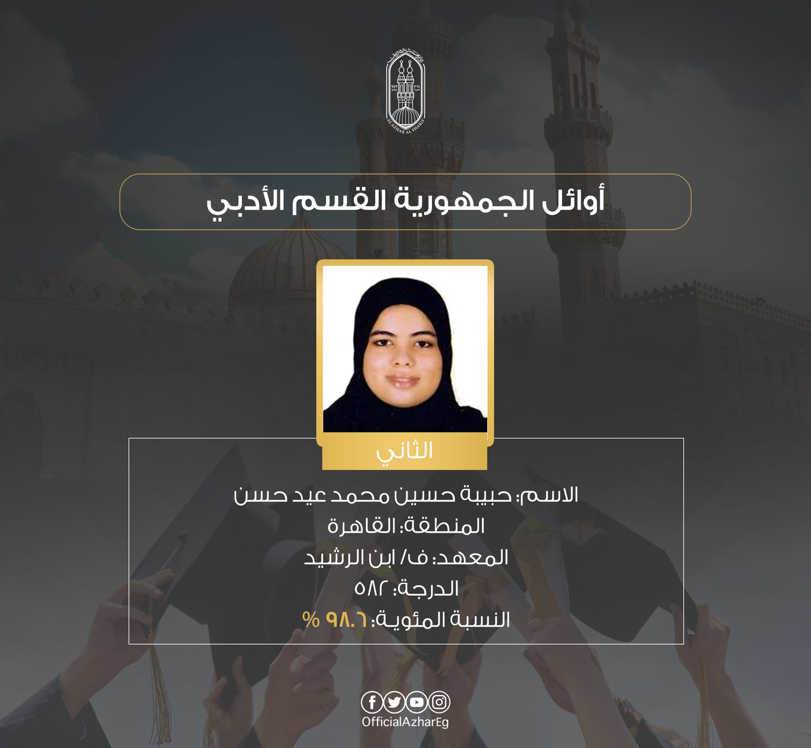 وجاء أوائل القسم الأدبي بالشهادة الثانوية الأزهرية على النحو التالي: