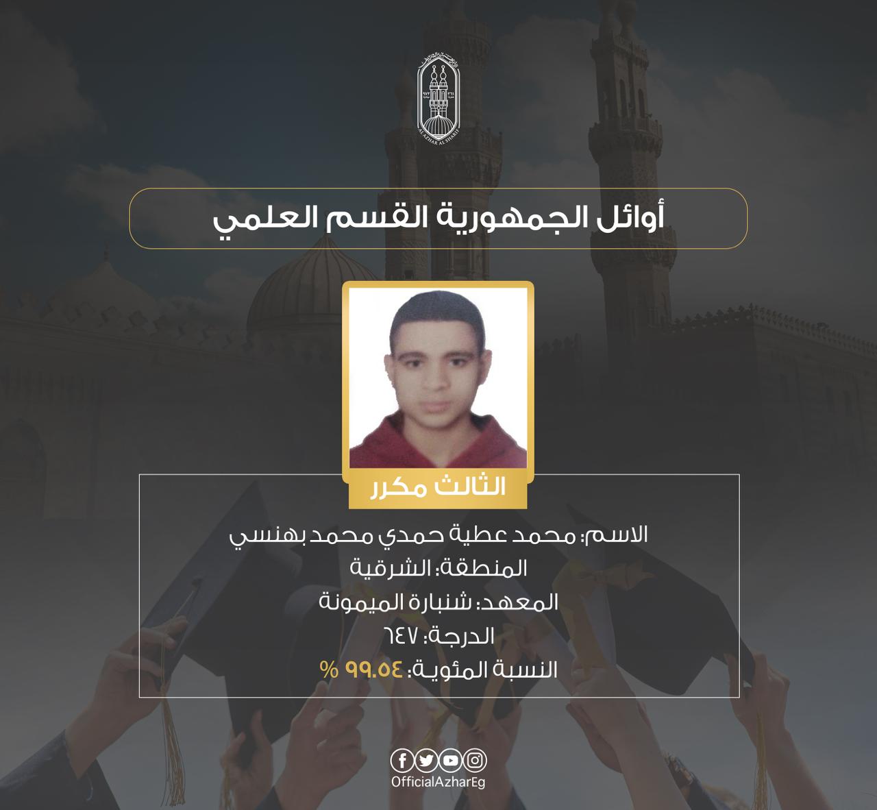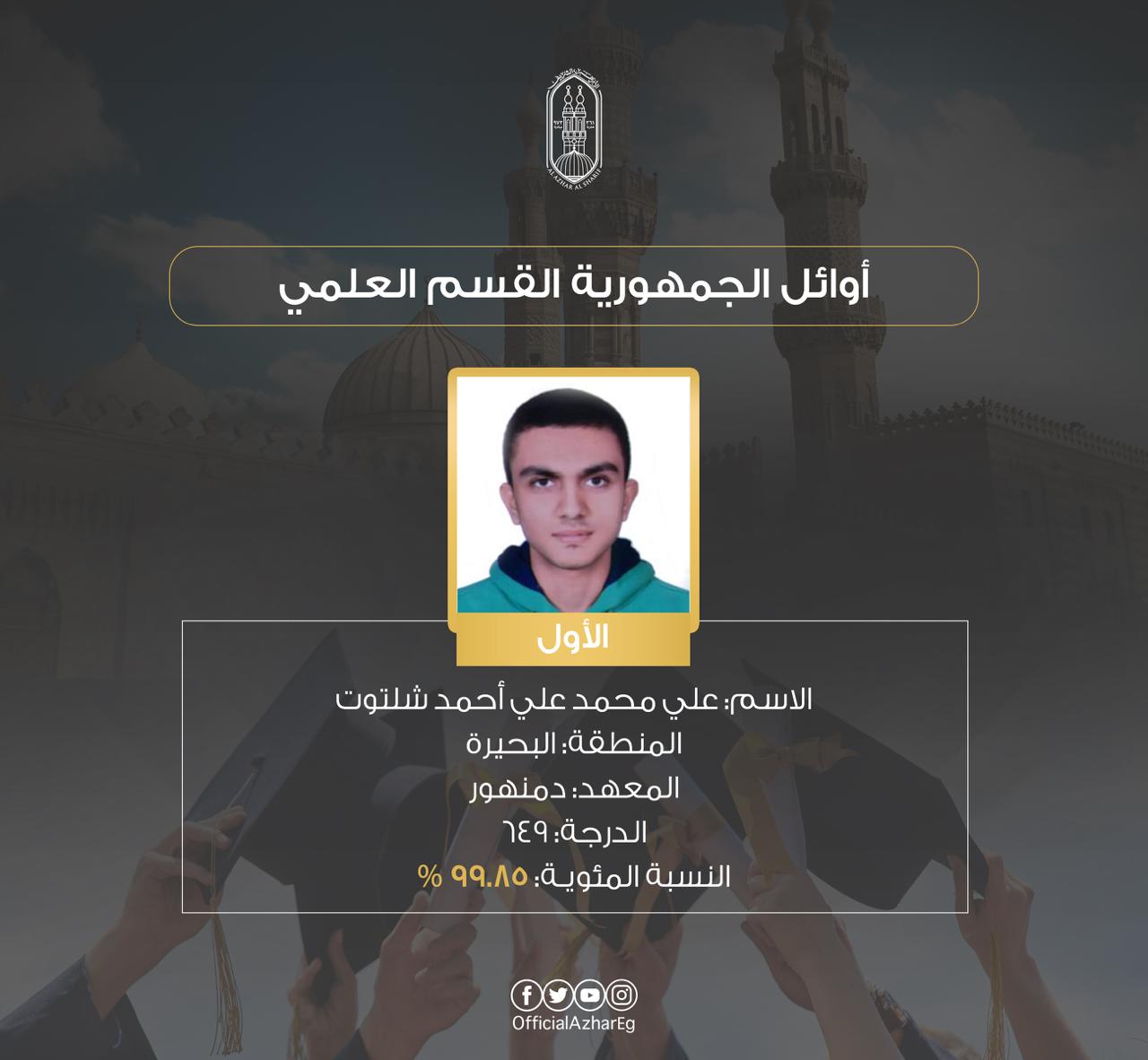 وجاء أوائل القسم العلمي بالشهادة الثانوية الأزهرية على النحو التالي: