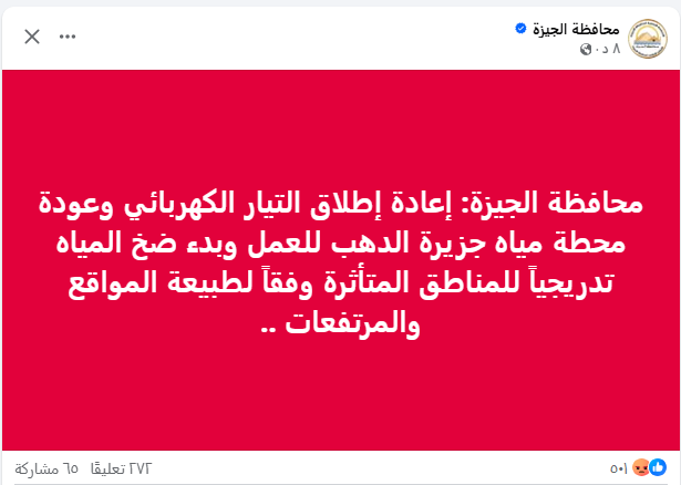 أعلنت محافظة الجيزة، إعادة إطلاق التيار الكهربائي وعودة محطة مياه جزيرة الدهب للعمل وبدء ضخ المياه تدريجياً للمناطق المتأثرة وفقاً لطبيعة المواقع والمرتفعات .