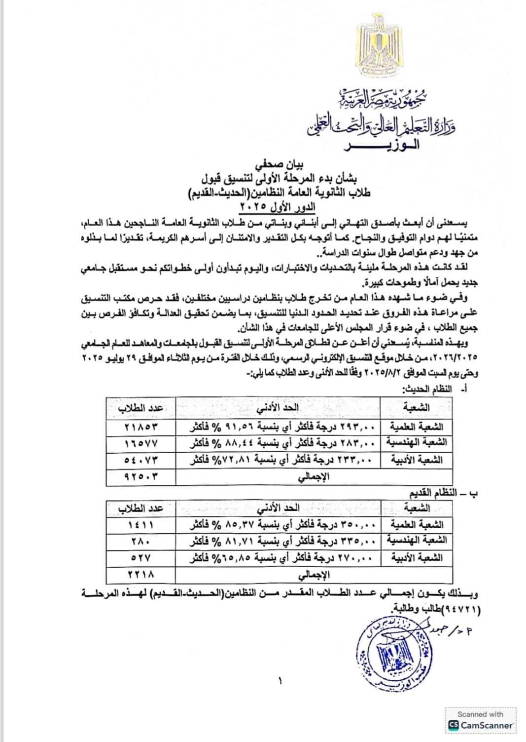 كشف الحد الأدنى لتنسيق المرحلة الأولى الذى أعلنه مكتب التنسيق عن ارتفاع الحدود الدنيا للمتقدمين بالمرحلة الأولى مقارنة بالعام الماضى، مما يشير إلى وجود ارتفاع فى شرائح مجاميع الطلاب بالثانوية العامة 2025 عن العام الماضى 2024، حيث سجل الحد الأدنى للمرحلة الأولى هذا العام 2025 لكليات الشعبة العلمية 293 درجة فأكثر بنسبة مئوية 91.56% بإجمالى عدد طلاب 21853 مقارنة بالعام الماضى حيث كان الحد الأدنى للمرحلة الأولى شعبة علمى علوم 371 درجة فى أكثر بنسبة 90.48% بإجمالى عدد طلاب 23850 ألف طالب، مما يشير لوجود ارتفاع فى تنسيق الكليات حوالى من 1 لـ 2 % فى كل كلية.