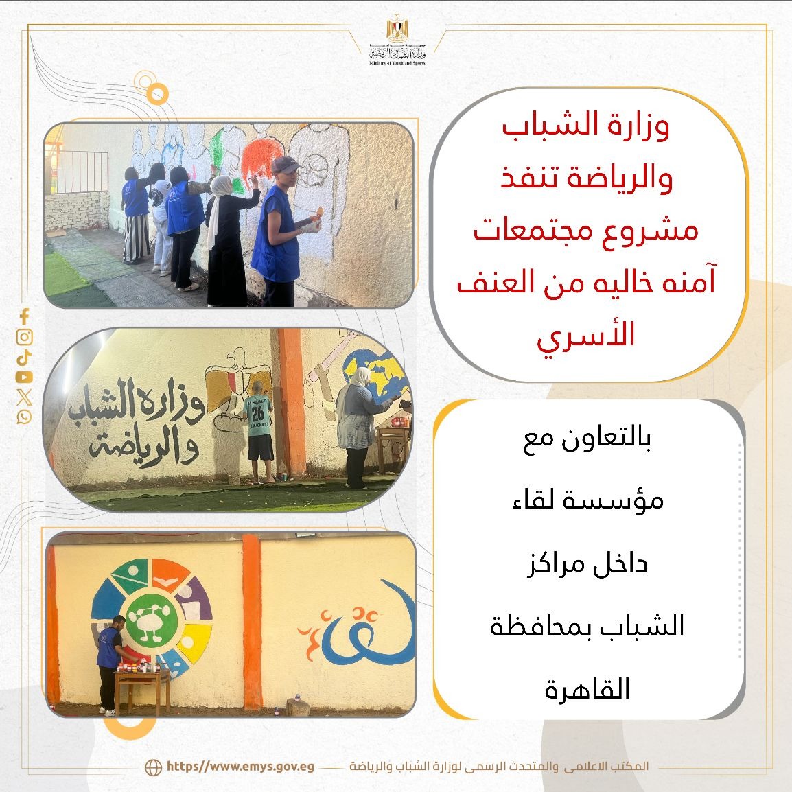 تنفذ وزارة الشباب والرياضة من خلال الإدارة المركزية لتمكين الشباب "الإدارة العامة لريادة الأعمال والمشروعات الناشئة " مشروع مجتمعات آمنه خاليه من العنف الأسري، بالتعاون مع مؤسسة "لقاء" داخل مراكز الشباب بمحافظة القاهرة.