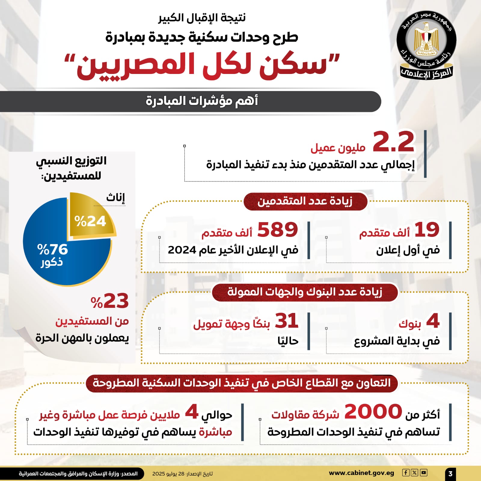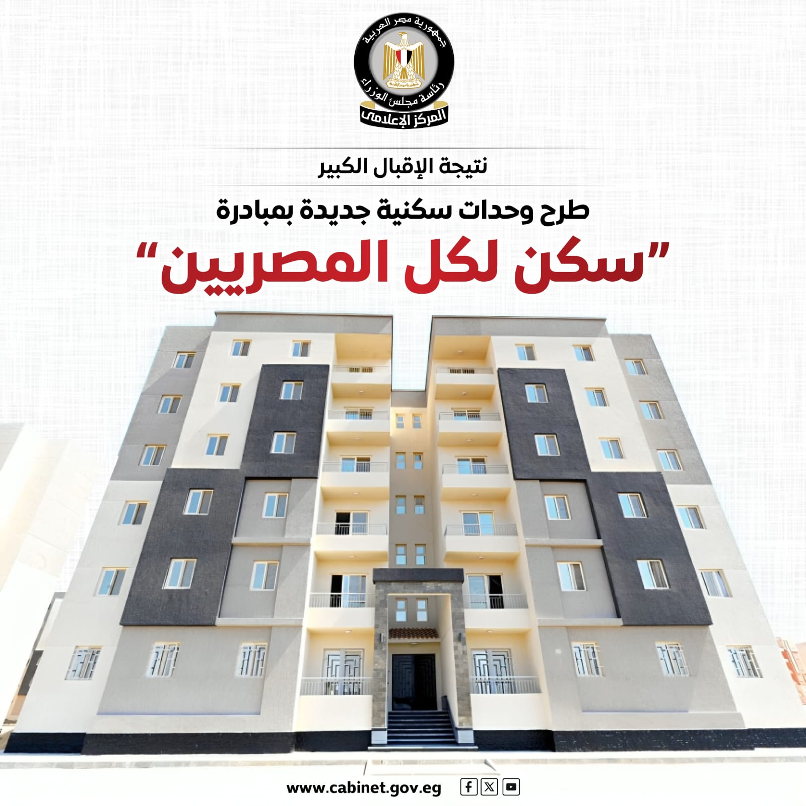 مرفق بيان وانفوجراف بعنوان: نتيجة الإقبال الكبير.. المركز الإعلامي لمجلس الوزراء: طرح وحدات سكنية جديدة بمبادرة "سكن لكل المصريين"، صادر عن المركز الإعلامي لمجلس الوزراء.