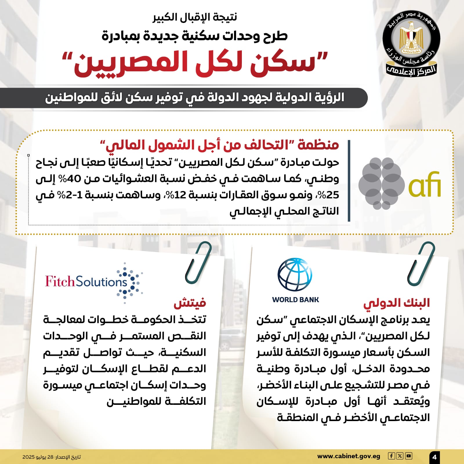 وبدورها أكدت منظمة "التحالف من أجل الشمول المالي"، أن مبادرة "سكن لكل المصريين" حولت تحديًا إسكانيًا صعبًا إلى نجاح وطني، كما ساهمت في خفض نسبة العشوائيات من 40% إلى 25%، ونمو سوق العقارات بنسبة 12%، وساهمت بنسبة 1-2% في الناتج المحلي الإجمالي.