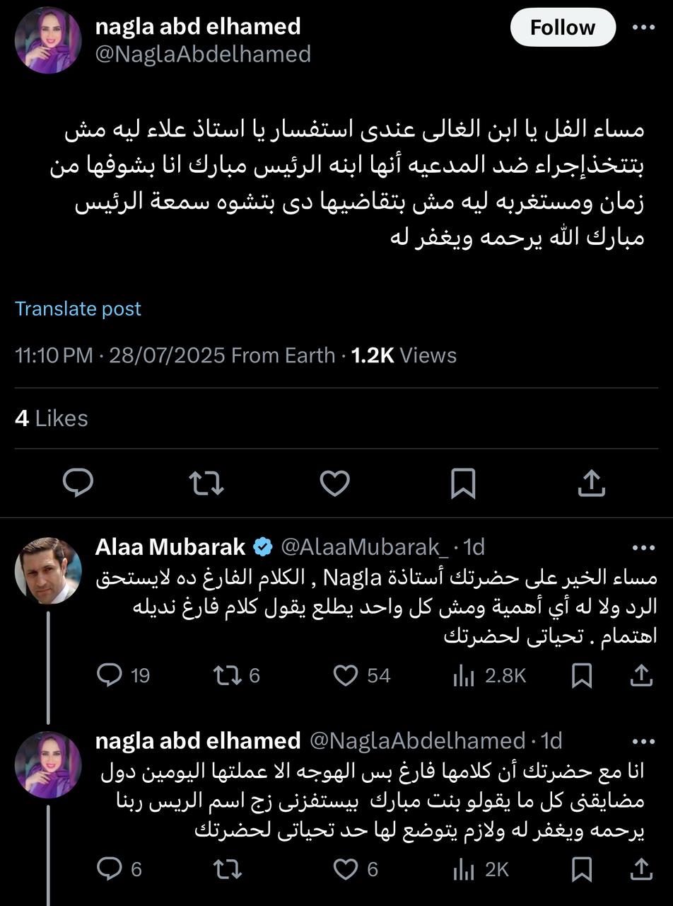 جاء ذلك بعد استفسار من إحدى المتابِعات، نجلاء عبد الحميد، عبر حسابه على منصة "إكس" (تويتر سابقًا)، حيث سألته: "ليه مش بتتخذ إجراء ضد المدعية؟ دي بتشوه سمعة الرئيس مبارك الله يرحمه".