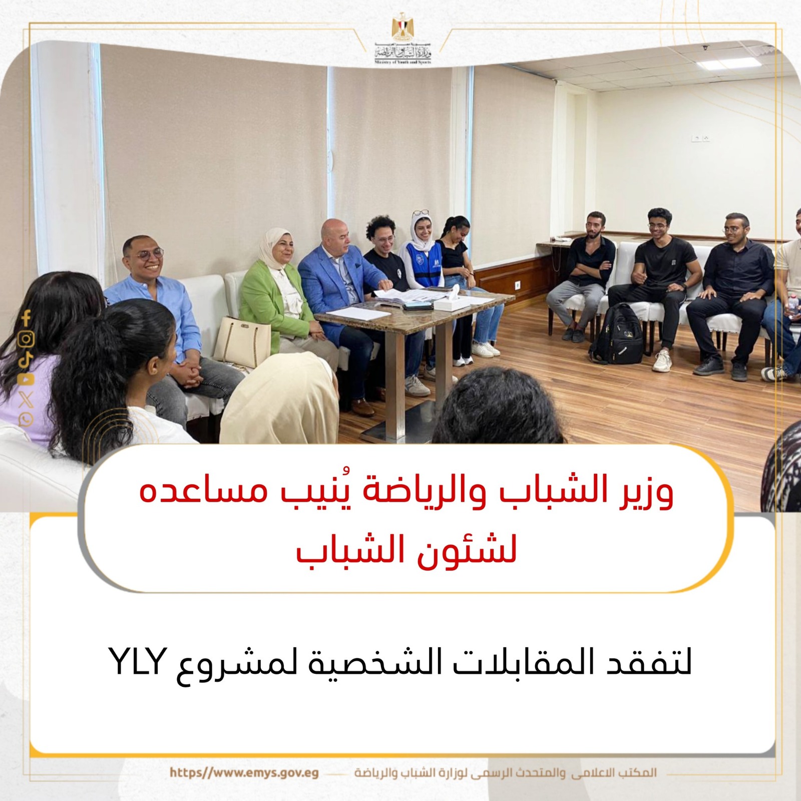 أناب الدكتور أشرف صبحي وزير الشباب والرياضة، اللواء إسماعيل الفار مساعد أول الوزير لشئون قطاع الشباب، والأستاذه منال جمال مستشار السيد الوزير ، لتفقد المقابلات الشخصية لمشروع YLY، بمقر المركز الأوليمبي بالمعادى، تحت إشراف الإدارة المركزية لشئون مكتب الوزير.