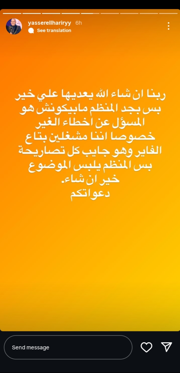 وكتب ياسر الحريري من خلال حسابه الرسمي عبر موقع تبادل الصور والفديوهات القصيرة "إنستجرام" عبر خاصية استوري، قال: "ربنا إن شاء الله يعديها على خير بس بجد المنظم مابيكونش هو المسؤل عن اخطاء الغير خصوصا اننا مشغلين بتاع الفاير وهو جايب كل تصاريحة بس المنظم يلبس الموضوع.. خير إن شاء الله دعواتكم".