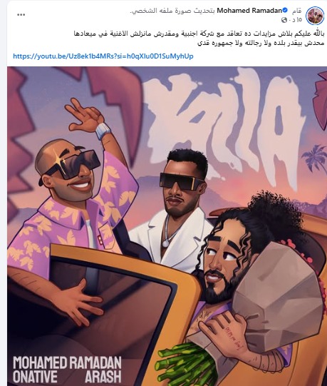 ووجه محمد رمضان رسالة لجمهوره بعد طرح أغنيته الجديدة، حيث كتب من خلال حسابه الرسمي عبر موقع التواصل الاجتماعي "فيسبوك"، قال:" بالله عليكم بلاش مزايدات ده تعاقد مع شركة أجنبية ومقدرش مانزلش الأغنية في ميعادها، محدش بيقدر بلده ولا رجالته ولا جمهوره قدي".