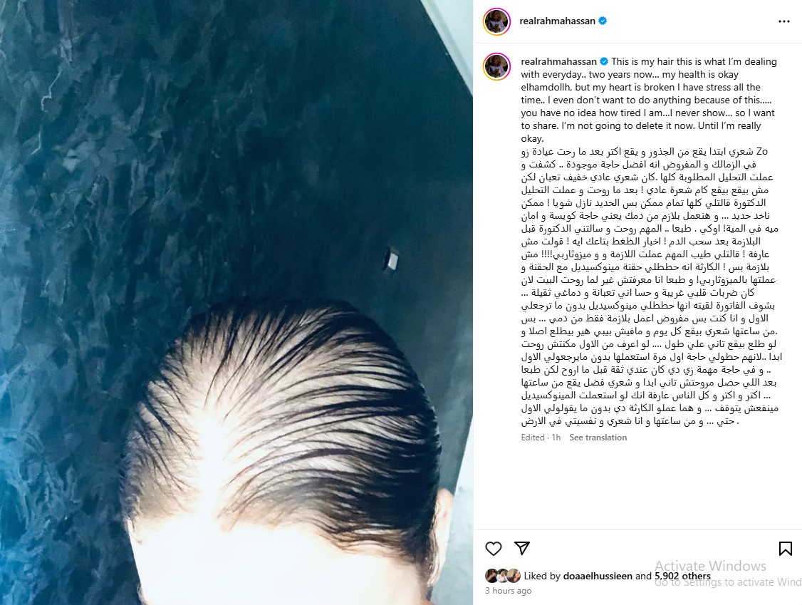ونشرت رحمة حسن صورة لـ شعرها، من خلال حسابها الرسمي عبر موقع تبادل الصور والفيديوهات القصيرة "إنستجرام"، وكتبت:"شعري ابتدا يقع من الجذور و يقع اكتر بعد ما رحت عيادة زو Zo في الزمالك و المفروض انه افضل حاجة موجودة .. كشفت و عملت التحليل المطلوبة كلها .كان شعري عادي خفيف تعبان لكن مش بيقع بيقع كام شعرة عادي ! بعد ما روحت و عملت التحليل الدكتورة قالتلي كلها تمام ممكن بس الحديد نازل شويا ! ممكن ناخد حديد … و هنعمل بلازم من دمك يعني حاجة كويسة و امان ميه في المية! اوكي . طبعا".