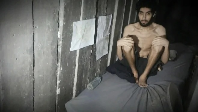المشهد الذي بدأ بلقطات يسجل فيها الأسير عمره بتاريخ 27 يوليو، يحكي قصة إنسان محاصر داخل أنفاق ضيقة بلا طعام كافٍ، ولا ماء شرب، حتى أنه يقول: "لم آكل منذ أيام"، الطعام لا يتعدى العدس والفاصوليا، ويضيف: "انظروا إلي كم أنا نحيف".