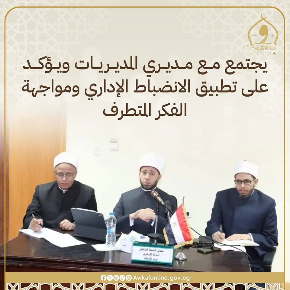 وزير الأوقاف في اجتماع موسع بمديري المديريات: التشديد على الانضباط الإداري التام... ومواجهة الفكر المتطرف وكل تحديات شعب مصر العظيم هو مهمتنا الكبرى.