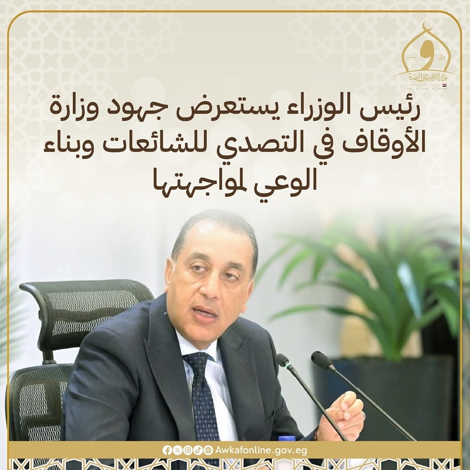 رئيس الوزراء يستعرض جهود وزارة الأوقاف في التصدي للشائعات وبناء الوعي لمواجهتها.