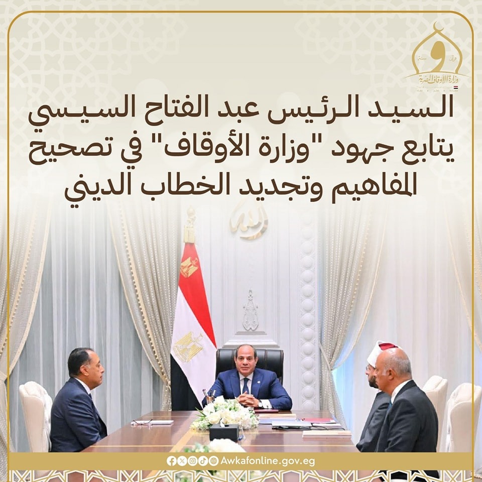 السيد الرئيس عبد الفتاح السيسي يتابع جهود "وزارة الأوقاف" في تصحيح المفاهيم وتجديد الخطاب الديني وتعزيز الوعي الوطني.