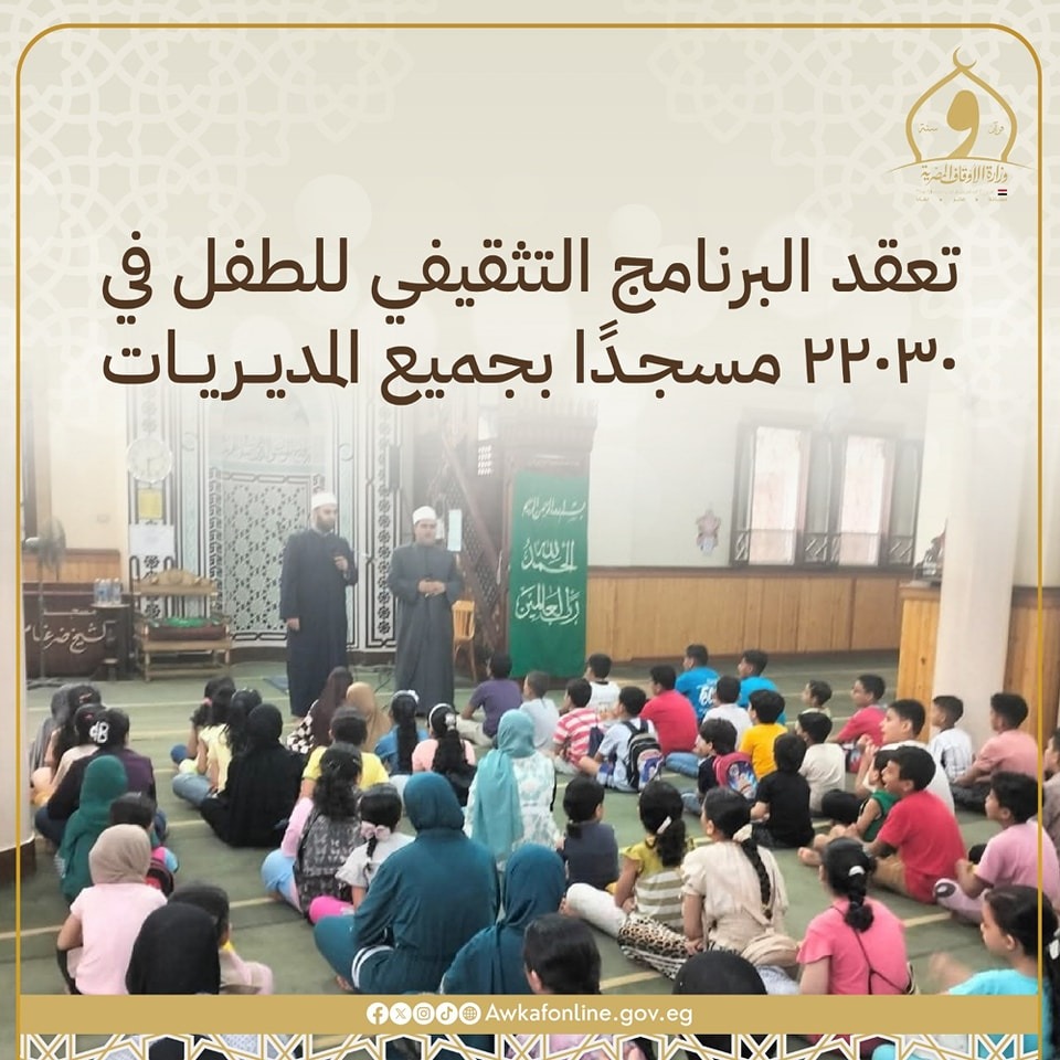 نفَّذت وزارة الأوقاف ٧٨١ مجلس فقه، وإقراء، وإفتاء للواعظات، وكرسي علماء، وملتقى فكري، وخاطرة واعظات؛ ٢١٣٧ درسًا منهجيًّا للأئمة والواعظات، وأسبوعًا ثقافيًّا، وقافلة دعوية؛ إلى جانب تنفيذ البرنامج التثقيفي للطفل في ٢٢٠٣٠ مسجدًا بجميع المديريات؛ إضافة إلى ٥٣٨٧ ندوة ثقافية وعلمية ومنبرًا ثابتًا، ومجلس علم وذكر، وصحة إنجابية، ولقاء الجمعة للطفل.