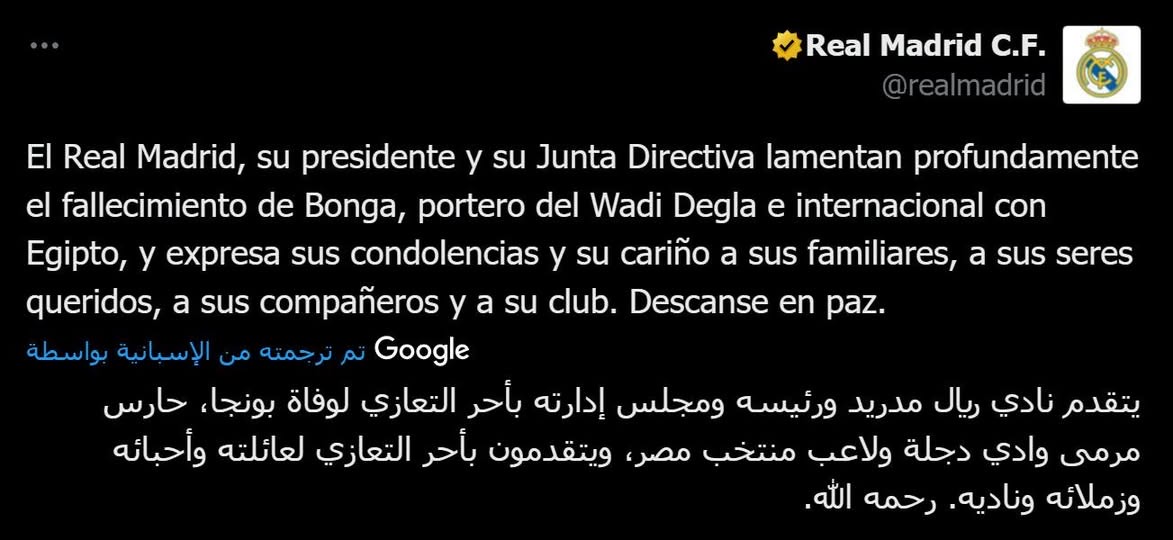 وأصدر النادي الملكي بيانًا رسميًا، قال فيه:"يتقدم نادي ريال مدريد، ورئيسه فلورنتينو بيريز، وأعضاء مجلس الإدارة، بخالص التعازي في وفاة محمد بونجا، حارس وادي دجلة ومنتخب مصر، ويتقدمون بخالص المواساة لعائلته وأحبائه وزملائه في الفريق والنادي. رحم الله الفقيد".
