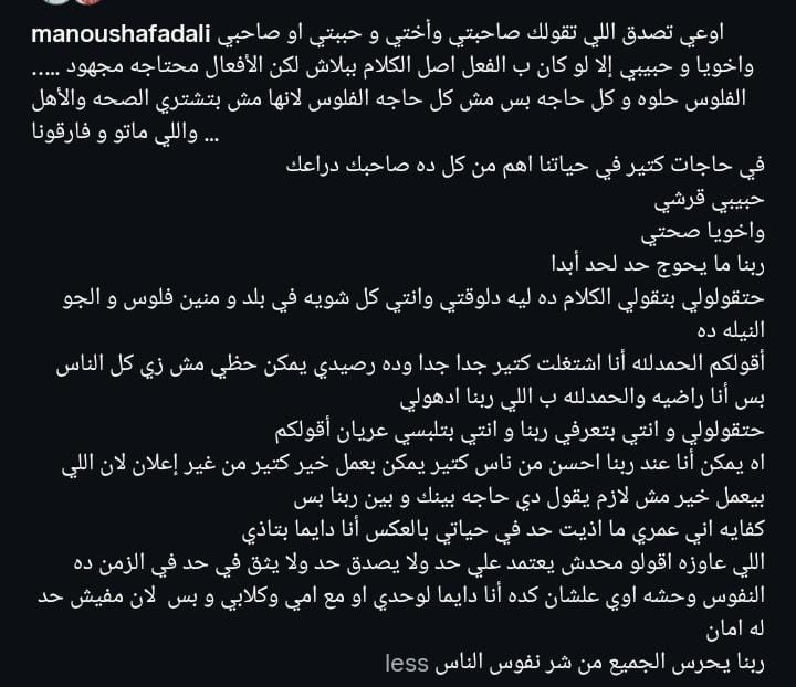 أضافت: "في حاجات كتير في حياتنا اهم من كل ده صاحبك دراعك، حبيبي قرشي، واخويا صحتي، ربنا ما يحوج حد لحد أبدا حتقولولي بتقولي الكلام ده ليه دلوقتي وانتي كل شويه في بلد و منين فلوس و الجو النيله ده أقولكم الحمدلله أنا اشتغلت كتير جدا جدا وده رصيدي يمكن حظي مش زي كل الناس بس أنا راضيه والحمدلله ب اللي ربنا ادهولي".