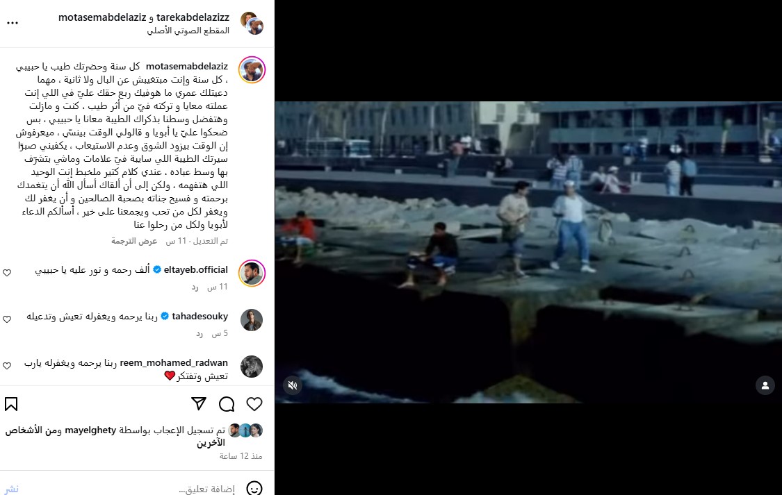 ونشر معتصم عبد العزيز مقطع فيديو لوالده من إحدى أفلامة القديمة، من خلال حسابه الرسمي عبر موقع تبادل الصور والفيديوهات القصيرة "إنستجرام"، وكتب:"كل سنة وحضرتك طيب يا حبيبي ، كل سنة وإنت مبتغيبش عن البال ولا ثانية ، مهما دعيتلك عمري ما هوفيك ربع حقك عليّ في اللي إنت عملته معايا و تركته فيّ من أثر طيب ، كنت و مازلت وهتفضل وسطنا بذكراك الطيبة معانا يا حبيبي".