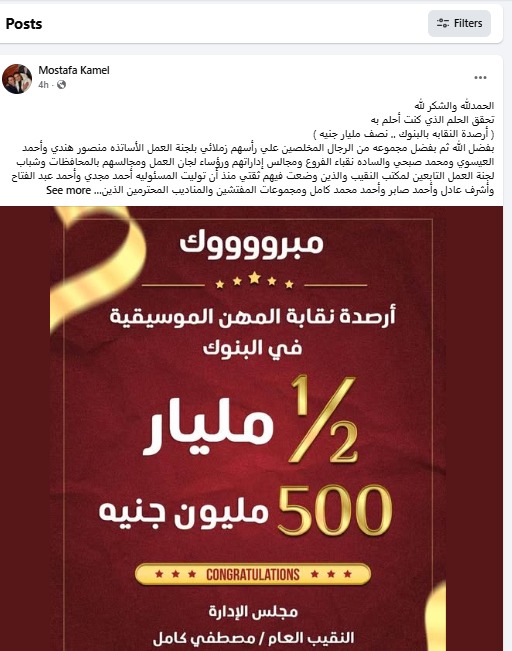 قال مصطفى كامل عبر صفحته الرسمية: «الحمدلله والشكر لله، تحقق الحلم الذي كنت أطمح إليه منذ توليت المسؤولية، أرصدة النقابة بالبنوك وصلت إلى نصف مليار جنيه، بفضل الله ثم بفضل مجموعة من الرجال المخلصين«.