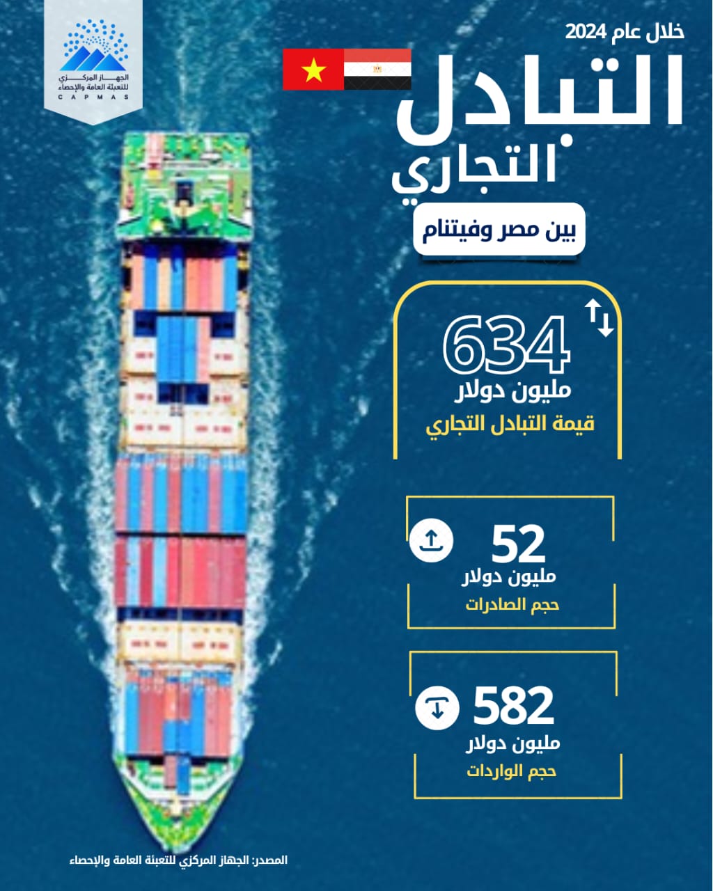 الإحصاء: "634 مليون دولار قيمة التبادل التجاري بين مصر وفيتنام خلال عام 2024"