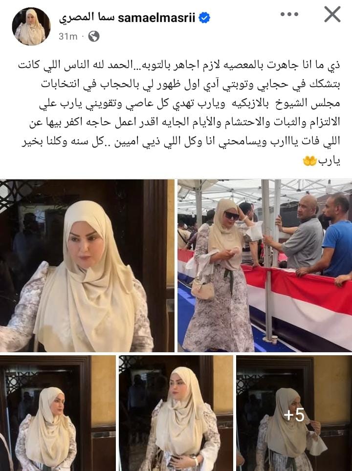 ونشرت سما المصري صور لها، من خلال حسابها الرسمي عبر موقع التواصل الاجتماعي فيسبوك، وعلقت: "ذي ما انا جاهرت بالمعصيه لازم اجاهر بالتوبه…الحمد لله الناس اللي كانت بتشكك في حجابي وتوبتي آدي اول ظهور لي بالحجاب في انتخابات مجلس الشيوخ بالازبكيه ويارب تهدي كل عاصي وتقويني يارب علي الالتزام والثبات والاحتشام والأيام الجايه اقدر اعمل حاجه اكفر بيها عن اللي فات يااارب ويسامحني انا وكل اللي ذيي اميين ..كل سنه وكلنا بخير يارب".