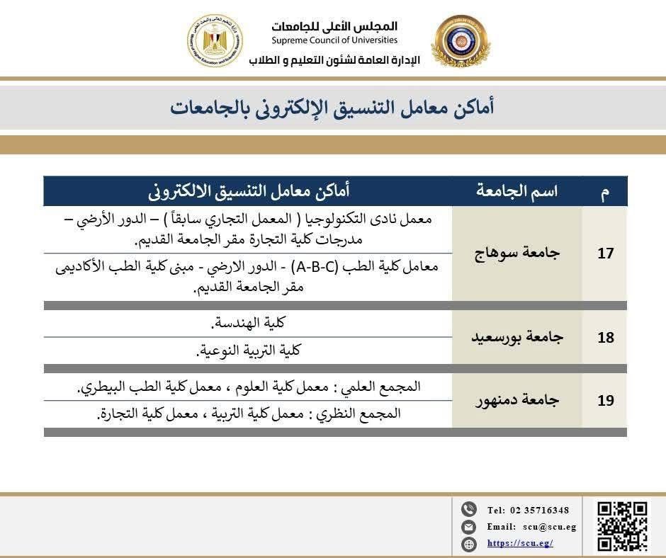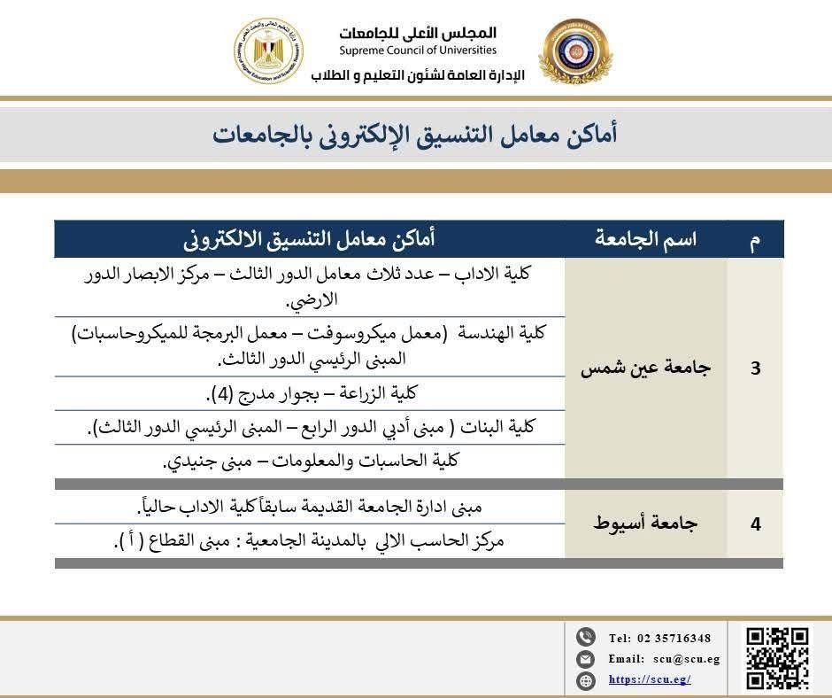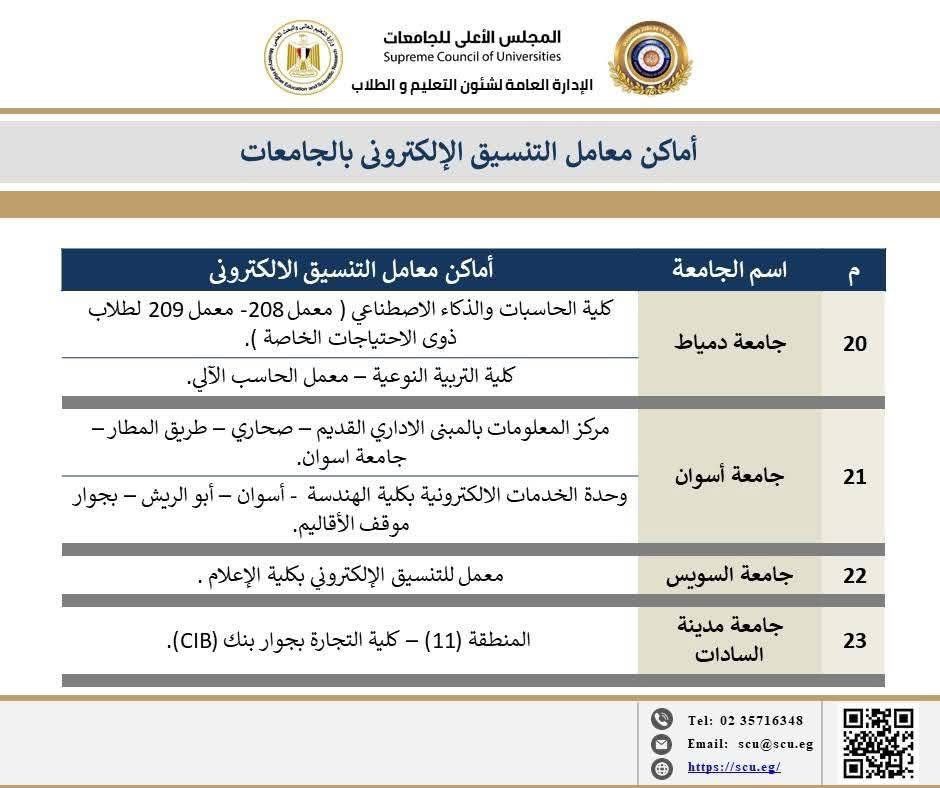وتواصل معامل الحاسب الآلي بالجامعات الحكومية تقديم خدمات الدعم الفني والإرشاد الكامل للطلاب، بما يسهم في تسهيل عملية تسجيل الرغبات على موقع التنسيق الإلكتروني، وضمان إدخال البيانات بشكل سليم وآمن.