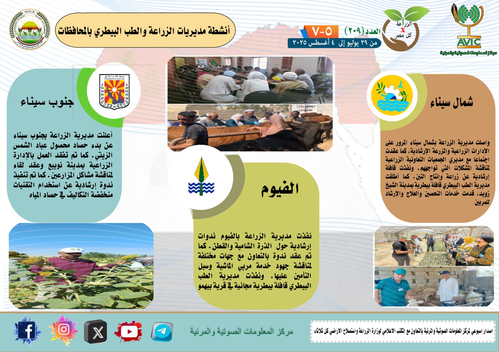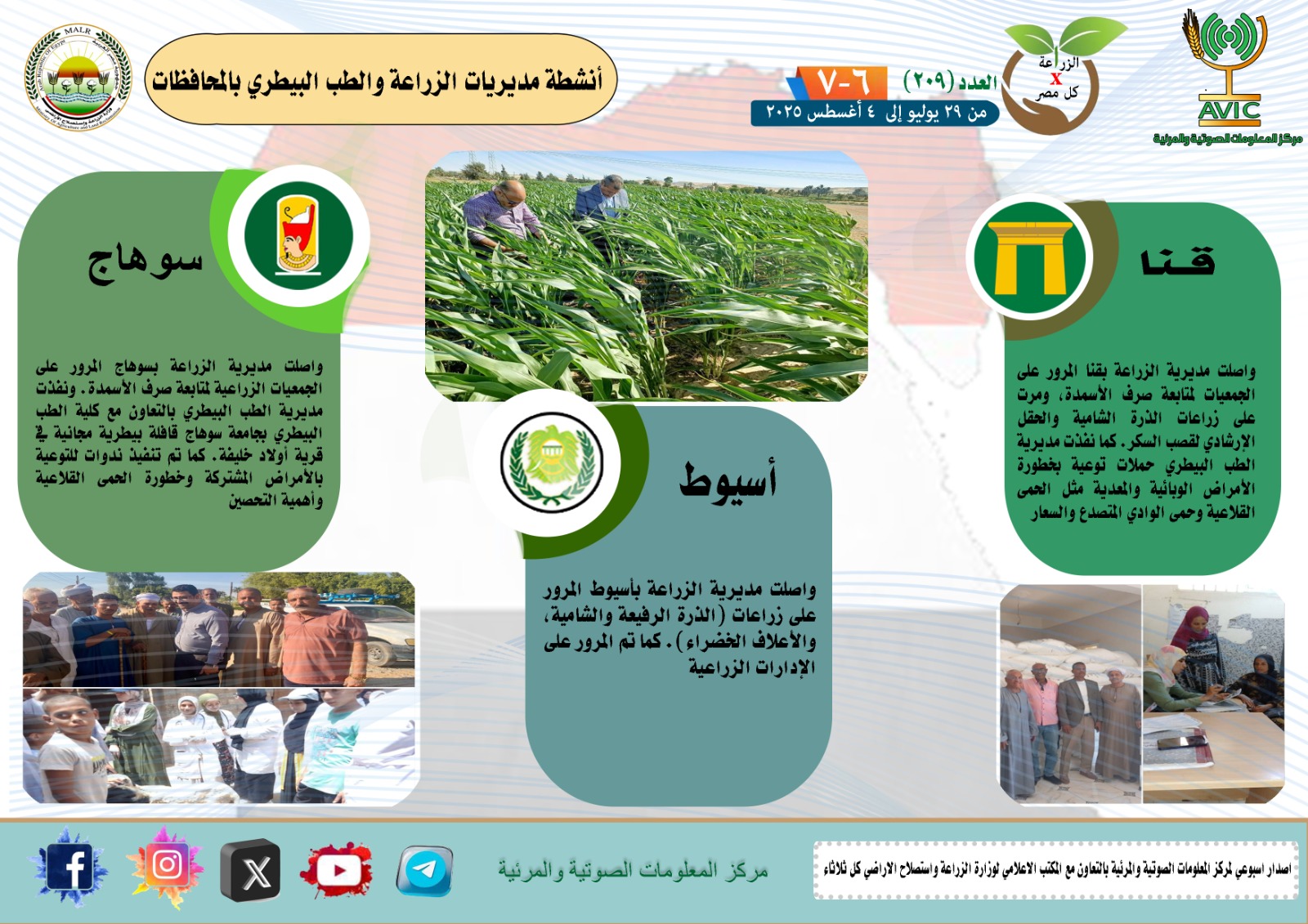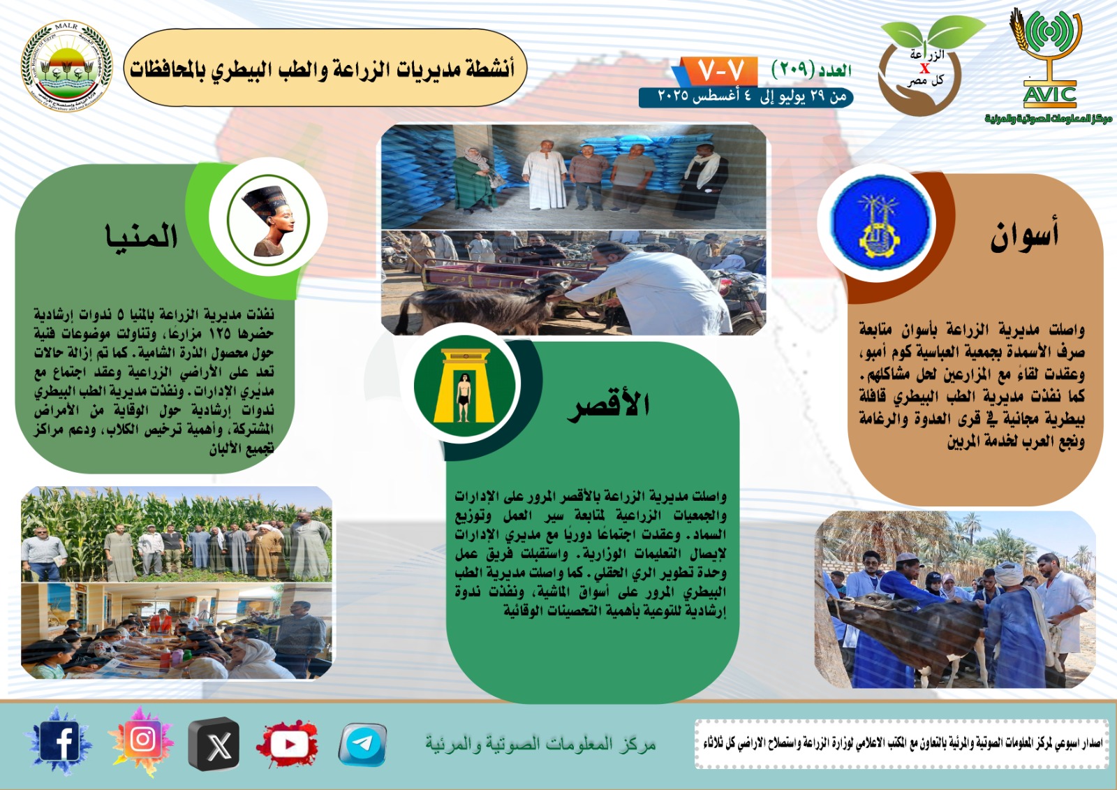 أصدر مركز المعلومات الصوتية والمرئية التابع لوزارة الزراعة واستصلاح الأراضي، والمكتب الاعلامي للوزارة، العدد رقم 209 من اصدار: "الزراعة في كل مصر" بالانفوجراف والفيديو، يوضح الجهود والانشطة التي تقوم بها مديريات الزراعة والطب البيطري بمحافظات الجمهورية خلال الفترة من 29 يوليو وحتى 4 اغسطس الجاري.
