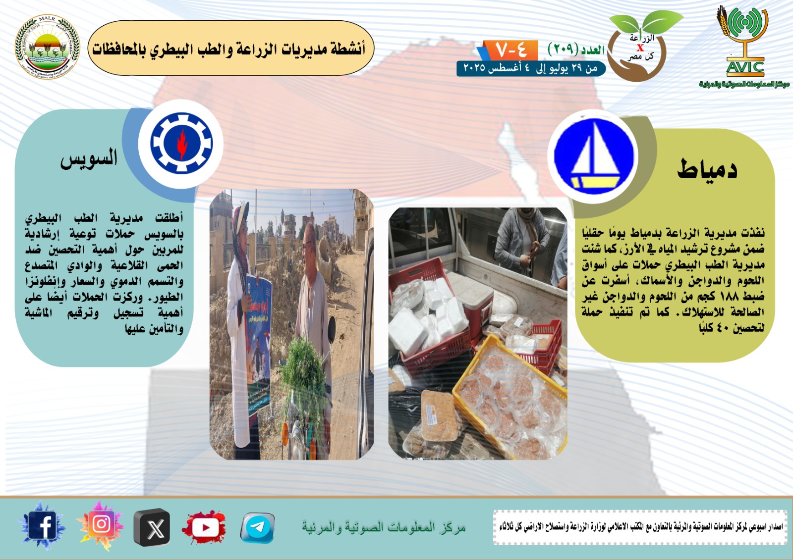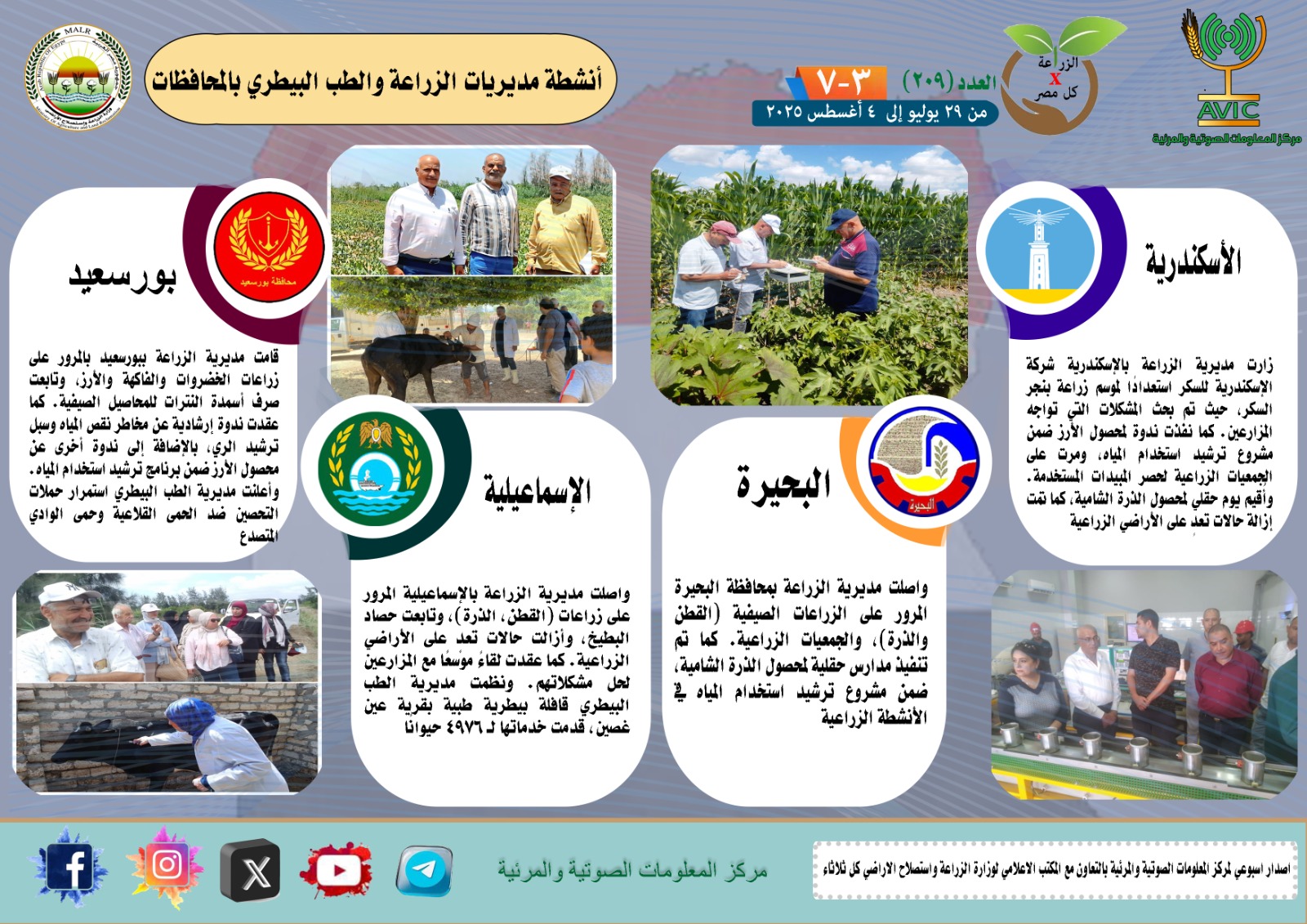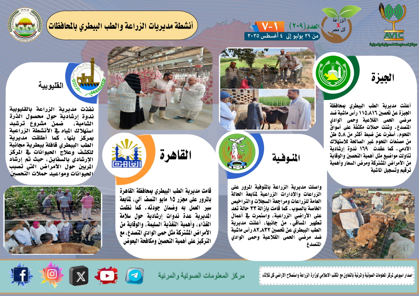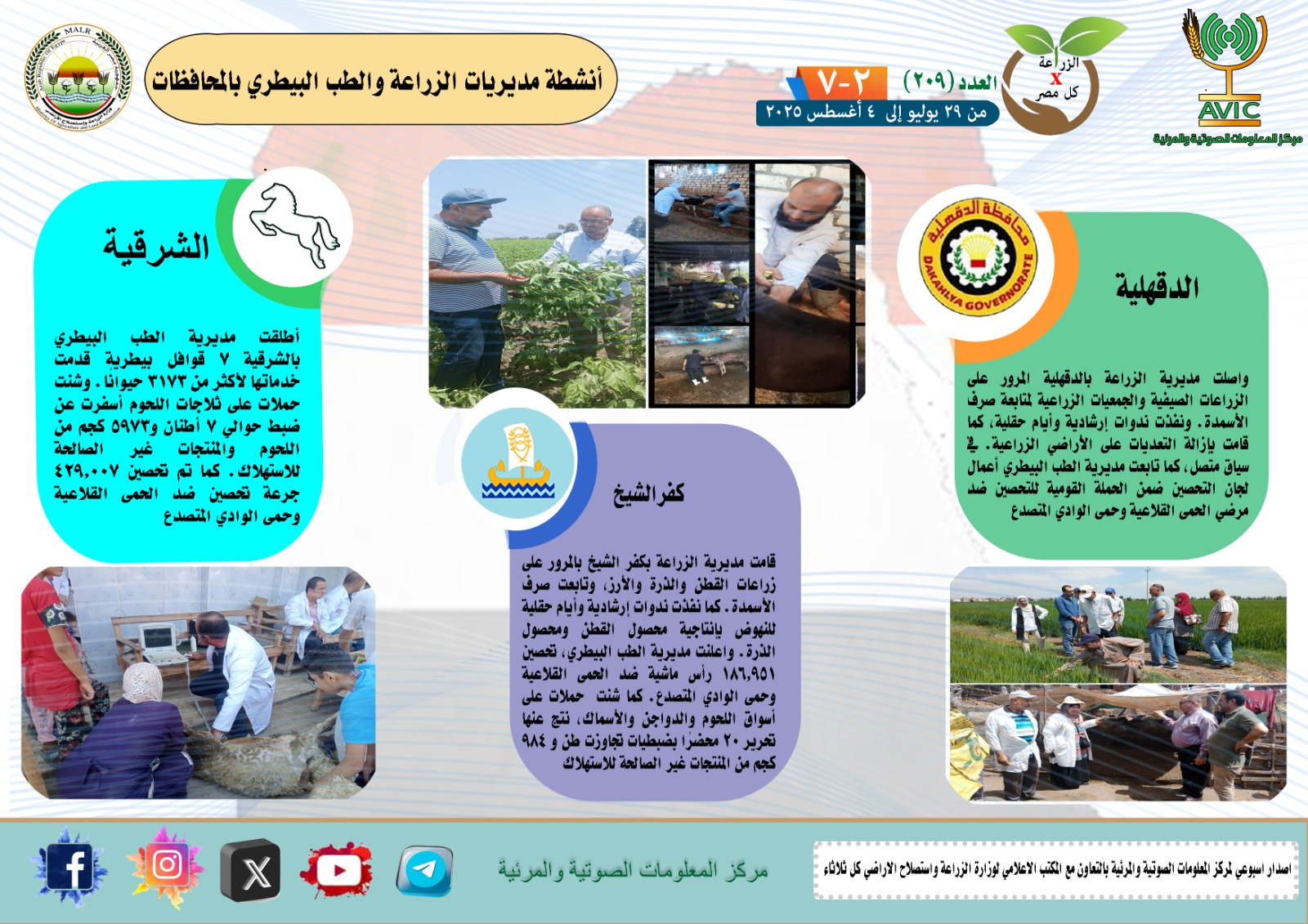 أصدر مركز المعلومات الصوتية والمرئية التابع لوزارة الزراعة واستصلاح الأراضي، والمكتب الاعلامي للوزارة، العدد رقم 209 من اصدار: "الزراعة في كل مصر" بالانفوجراف والفيديو، يوضح الجهود والانشطة التي تقوم بها مديريات الزراعة والطب البيطري بمحافظات الجمهورية خلال الفترة من 29 يوليو وحتى 4 اغسطس الجاري.