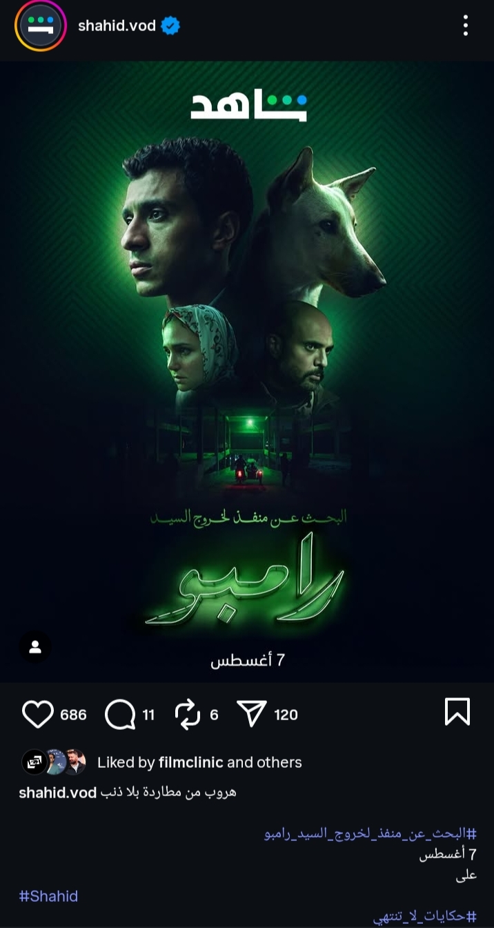 ونشرت منصة شاهد البوستر الرسمي لـ فيلم البحث عن منفذ لخروج السيد رامبو من خلال حسابها الرسمي عبر موقع تبادل الصور والفديوهات القصيرة "إنستجرام"، وعلقت:"هروب من مطاردة بلا ذنب.. البحث عن منفذ لخروج السيد رامبو 7 أغسطس على شاهد".