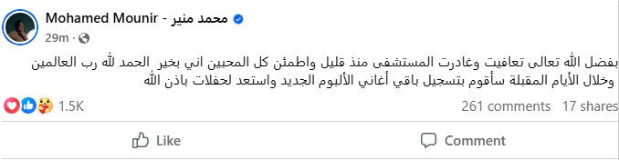 وكتب الكينج من خلال حسابه الرسمي عبر موقع التواصل الاجتماعي "فيسبوك"، قال: "بفضل الله تعالى تعافيت وغادرت المستشفى منذ قليل واطمئن كل المحبين اني بخير الحمد لله رب العالمين.. وخلال الأيام المقبلة سأقوم بتسجيل باقي أغاني الألبوم الجديد واستعد لحفلات باذن الله".