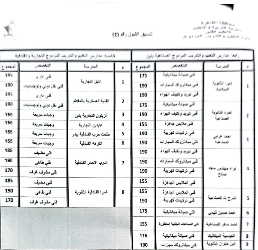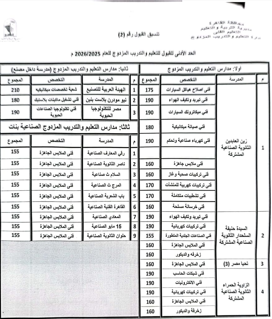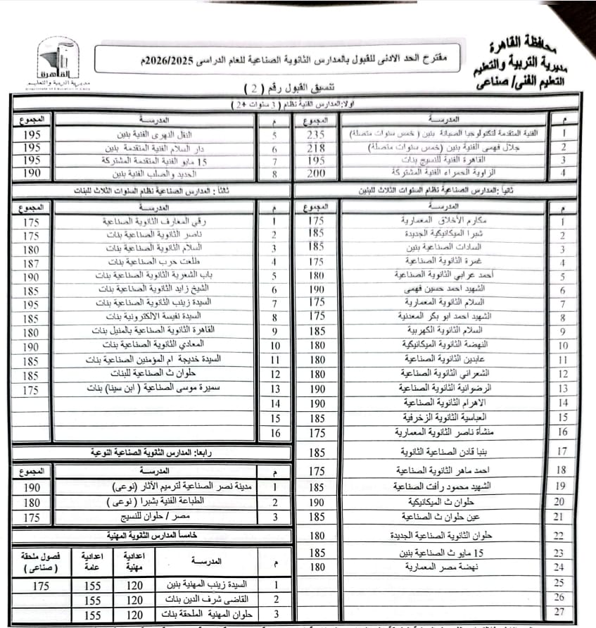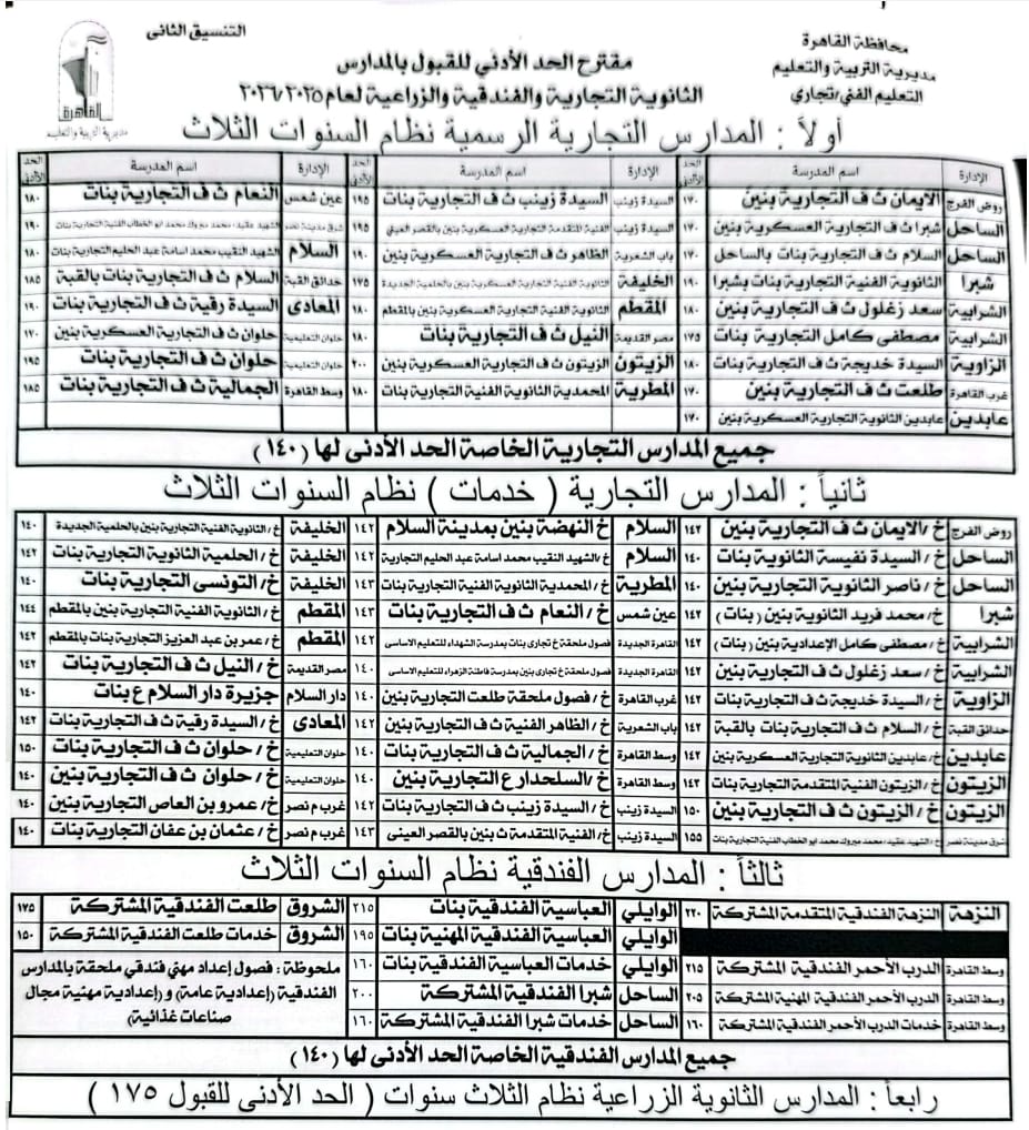 قرر د. إبراهيم صابر محافظ القاهرة النزول بدرجة الحد الأدنى لتنسيق القبول بمدارس التعليم الفنى( صناعى، تجارى ، فندقى، زراعى) للعام الدراسى ٢٠٢٥/ ٢٠٢٦ بالمدارس التى يوجد بها أماكن شاغرة.