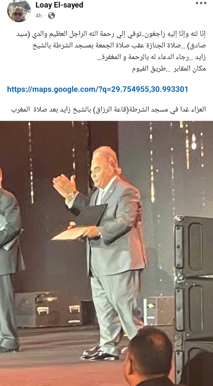 وأعلن عن موعد العزاء: "العزاء غدا في مسجد الشرطة (قاعة الرزاق) بالشيخ زايد بعد صلاة المغرب".
