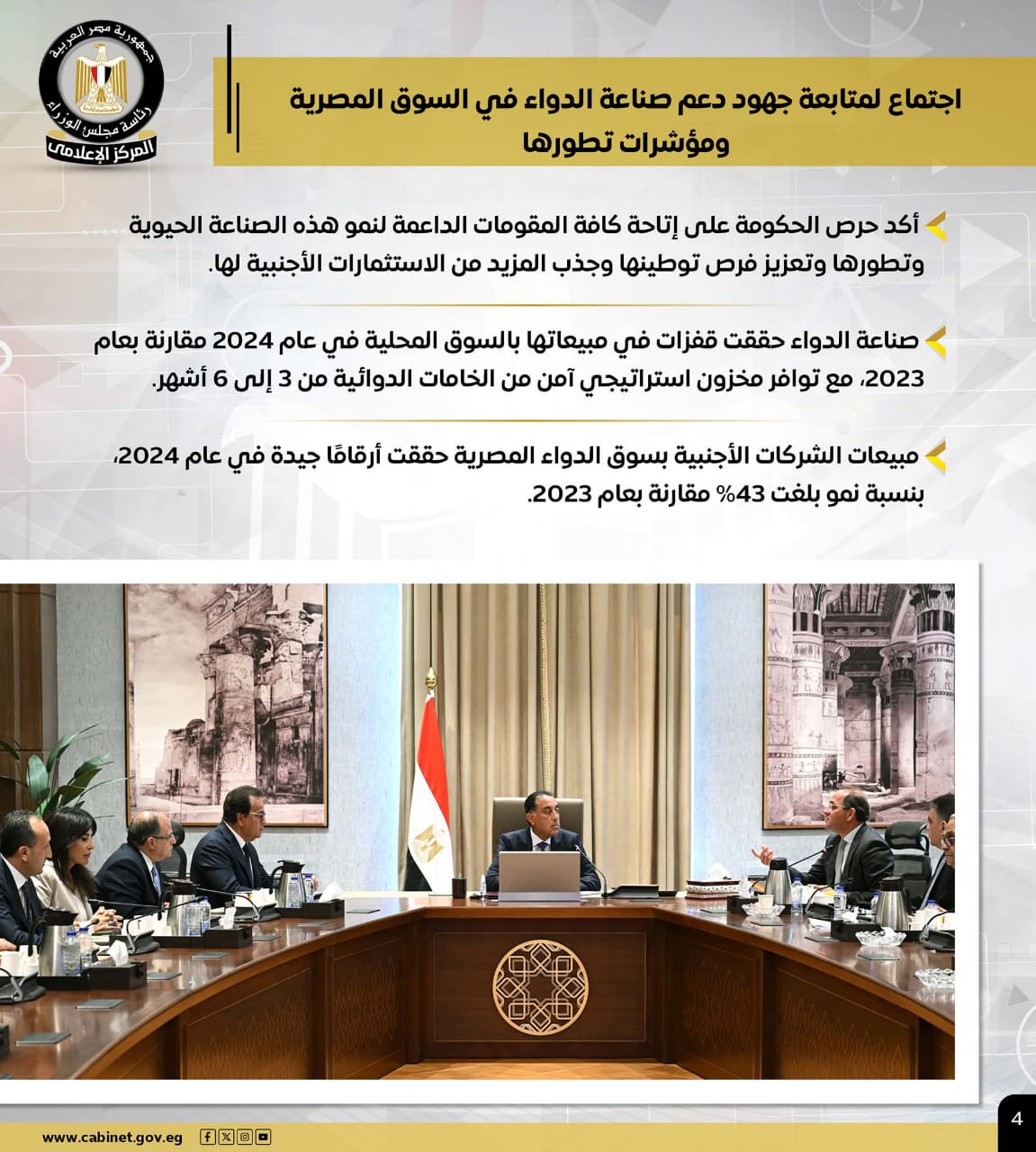 كما عقد اجتماعًا لمتابعة جهود دعم صناعة الدواء في السوق المصرية، ومؤشرات تطورها، مؤكدًا اهتمام الحكومة بإتاحة كافة المقومات الداعمة لنمو هذه الصناعة الحيوية، وتعزيز فرص توطينها، وجذب المزيد من الاستثمارات الأجنبية لها.