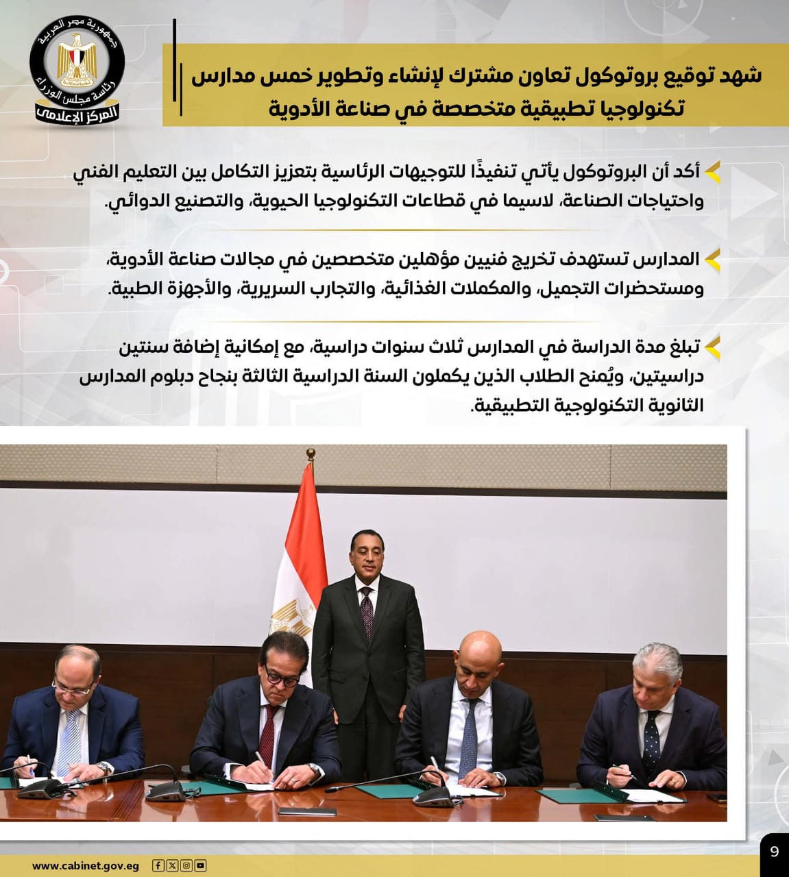 وشهد توقيع بروتوكول تعاون مشترك لإنشاء وتطوير 5 مدارس تكنولوجيا تطبيقية متخصصة في صناعة الأدوية، مؤكدًا أن البروتوكول يأتي تنفيذًا للتوجيهات الرئاسية بتعزيز التكامل بين التعليم الفني واحتياجات الصناعة، لاسيما في قطاعات التكنولوجيا الحيوية، والتصنيع الدوائي.