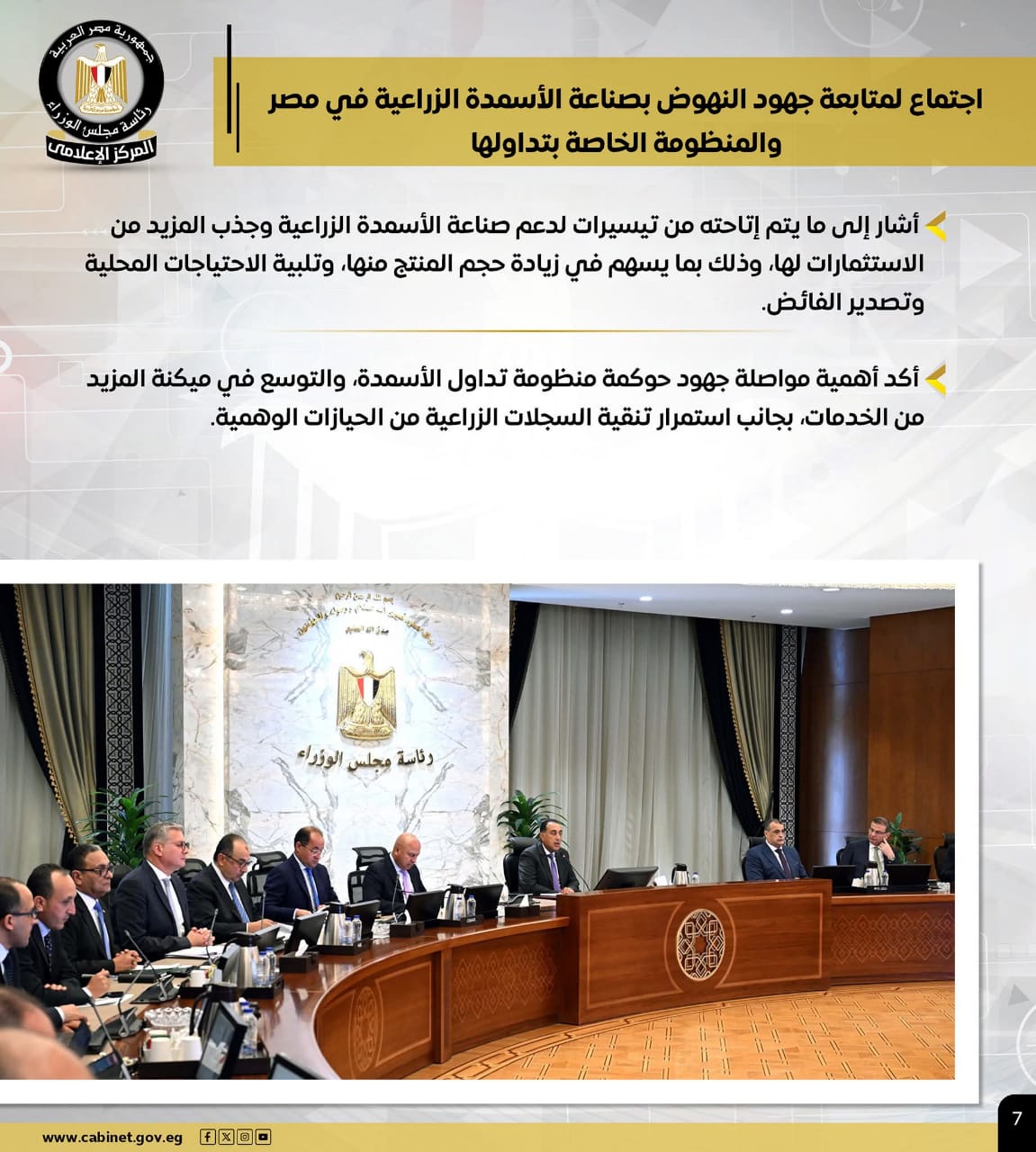 وشملت الانفوجرافات اجتماعه لمتابعة جهود النهوض بصناعة الأسمدة الزراعية في مصر، والمنظومة الخاصة بتداولها، وتمت الإشارة إلى ما يتم إتاحته من تيسيرات لدعم هذه الصناعة، وجذب المزيد من الاستثمارات لها، بالإضافة الي مواصلة جهود حوكمة المنظومة، والتوسع في ميكنة المزيد من الخدمات.