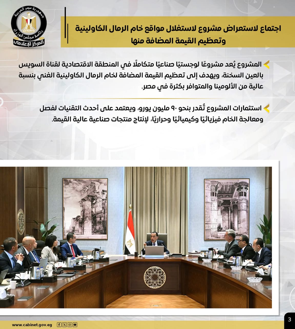 وتضمنت أنشطة رئيس الوزراء اجتماعًا لاستعراض مشروع لاستغلال مواقع خام الرمال الكاولينية وتعظيم القيمة المضافة منها، باعتباره مشروعًا لوجستيًا صناعيًا متكاملًا في المنطقة الاقتصادية لقناة السويس، وتُقدر استثماراته بنحو ٩٠ مليون يورو.