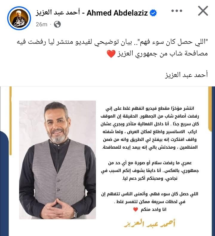 وكتب أحمد عبد العزيز من خلال حسابه الرسمي عبر موقع التواصل الاجتماعي "فيسبوك"، قال: "انتشر مؤخرًا فيديو اتفهم غلط على إني رفضت أصافح شاب من الجمهور، الحقيقة إن الموقف كان سريع جدًا، أنا داخل الفعالية متأخر وبجري عشان أركب الأسانسير وأطلع لمكان العرض، ولما شفته واقف افتكرت إنه بيفتح لي الطريق وإنه من ضمن المنظمين، ومخدتش بالي إنه بيمد إيده للمصافحة".