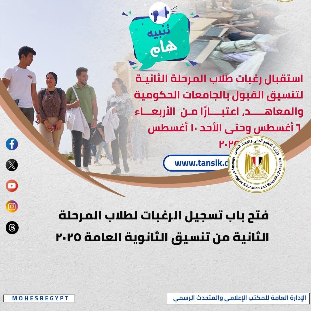حيث بدأ تسجيل الرغبات اعتبارًا من الأربعاء الموافق ٦ أغسطس، ويستمر حتى الأحد الموافق ١٠ أغسطس ٢٠٢٥.