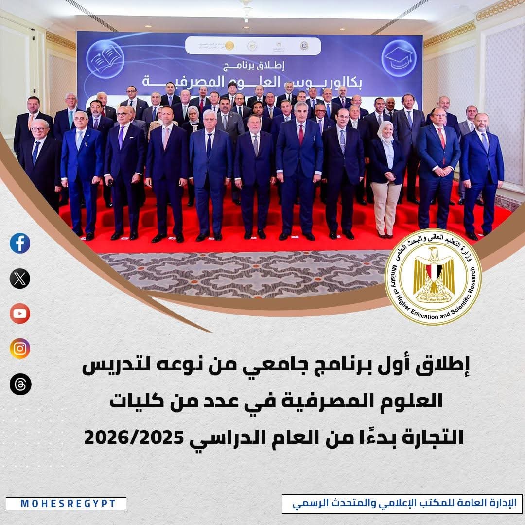 أطلق البنك المركزي المصري بالتعاون مع وزارة التعليم العالي والبحث العلمي والمجلس الأعلى للجامعات، والمعهد المصرفي المصري (EBI) برنامج شهادة البكالوريوس في العلوم المصرفية، وذلك في كليات التجارة بعدد من الجامعات المصرية بدءًا من العام الدراسي 2025/2026، كخطوة استراتيجية نحو إعداد جيل جديد من الكفاءات المصرفية تعزز دفع عجلة التنمية المالية والاقتصادية، ومن جانبه أعلن الدكتور/ أيمن عاشور وزير التعليم العالي والبحث العلمي أن إطلاق برنامج شهادة البكالوريوس في العلوم المصرفية يأتي انطلاقًا من إيمان وزارة التعليم العالي والبنك المركزي المصري بأهمية التعاون والتكامل لتقديم برامج دراسية حديثة تواكب احتياجات سوق العمل.