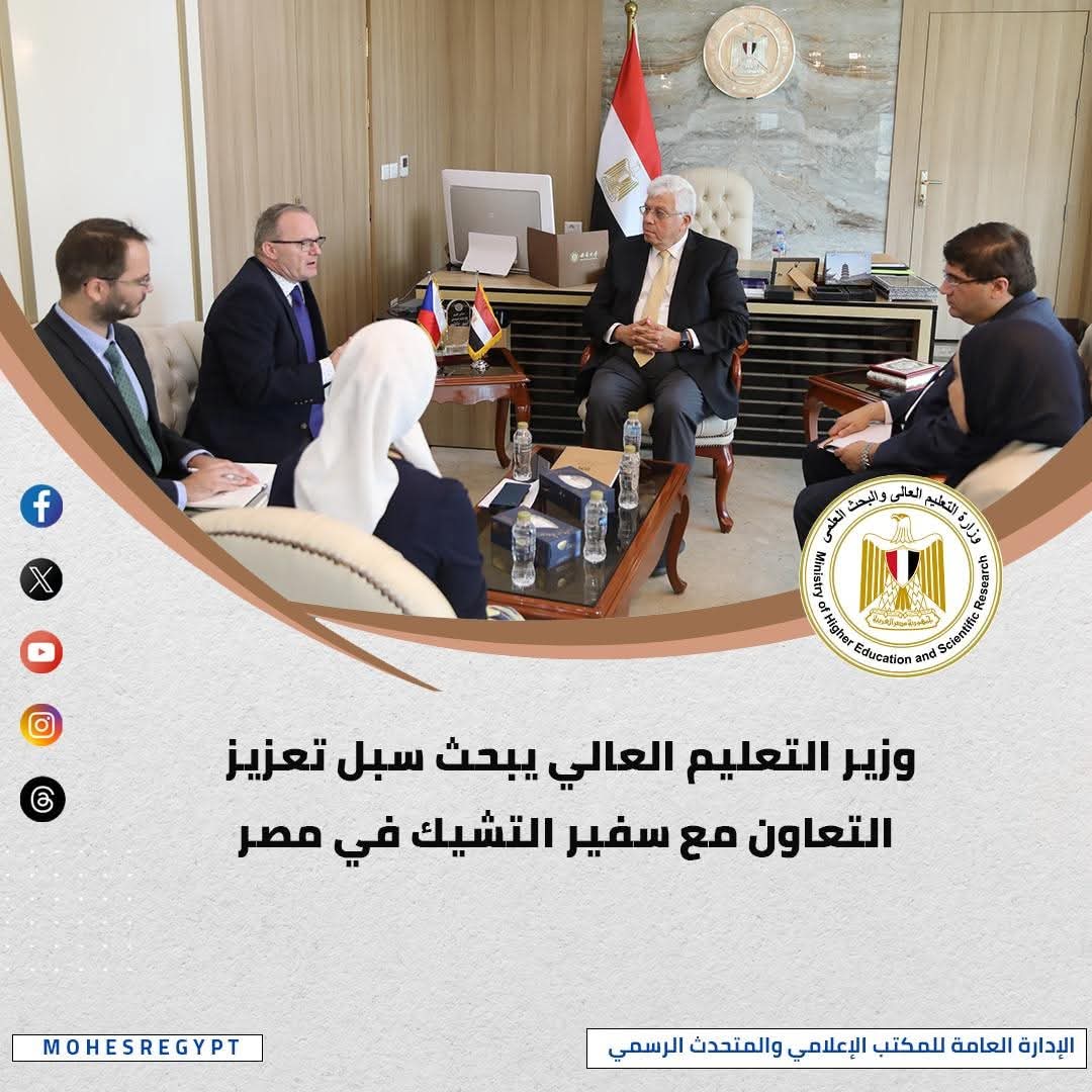 استقبل الدكتور أيمن عاشور وزير التعليم العالي والبحث العلمي، السيد/ إيفان يوكل سفير جمهورية التشيك في مصر، وخلال الاجتماع أكد الوزير على عمق العلاقات التي تجمع مصر والتشيك، مشيرًا إلى تطلع مصر لتعظيم هذه العلاقات والتوسع في عقد الشراكة الأكاديمية والبحثية بين البلدين، وأكد الدكتور أيمن عاشور أهمية تعزيز التعاون الأكاديمي والبحثي بين المؤسسات التعليمية والبحثية المصرية والتشيكية، ودعم سبل التواصل بين الجانبين بما يفتح آفاقًا أوسع للشراكة العلمية والأكاديمية التي تخدم أولويات البلدين وتُسهم في بناء القدرات البشرية.