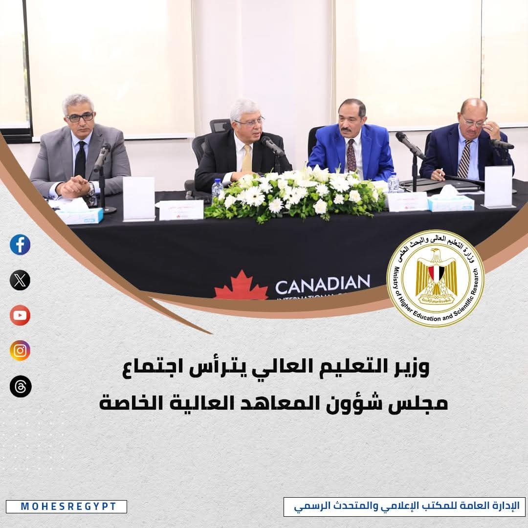 ترأس الدكتور أيمن عاشور، وزير التعليم العالي والبحث العلمي، اجتماع المجلس الأعلى لشؤون المعاهد العالية الخاصة، والذي استضافته مجموعة المعاهد الكندية (CIC)، وخلال الاجتماع وجه الدكتور أيمن عاشور بإنشاء قاعدة بيانات محدثة دوريًا بإمكانيات المعاهد وإنجازاتها، مشيرًا إلى ضرورة اهتمام المعاهد بإنشاء مراكز للتوظيف والابتكار، ودعم ريادة الأعمال.