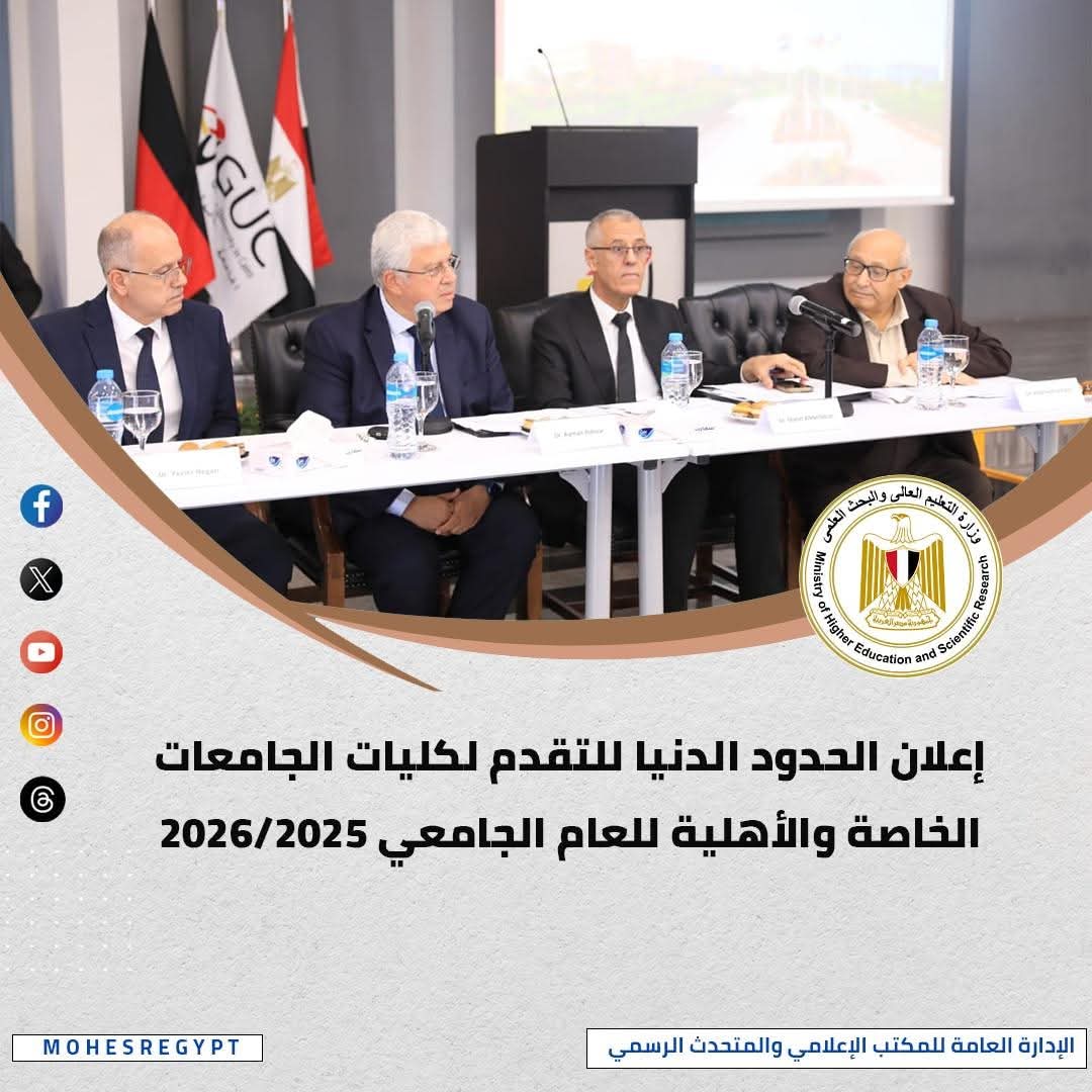 ترأس د.أيمن عاشور وزير التعليم العالي والبحث العلمي، الاجتماع المشترك لمجلسي الجامعات الخاصة والأهلية، وخلال الاجتماع أشار الوزير إلى تحديد الحدود الدنيا للتقدم للكليات بالجامعات الخاصة والأهلية، وذلك لطلاب شهادة الثانوية العامة وما يعادلها من شهادات عربية وأجنبية للعام الجامعي 2025/2026.