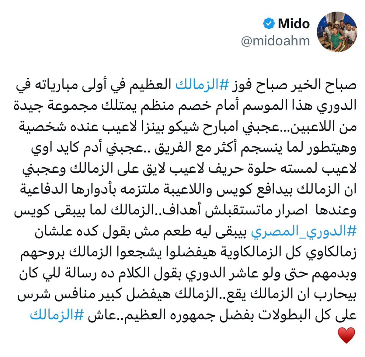 وكتب ميدو عبر حسابه الرسمي على منصة "X"صباح اليوم: "صباح الخير، صباح فوز الزمالك العظيم أمام خصم منظم يمتلك مجموعة جيدة من اللاعبين".