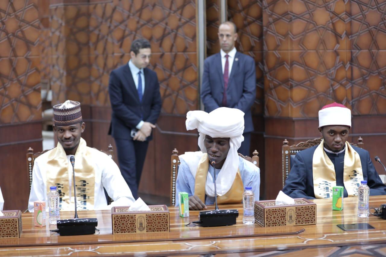 وحرص شيخ الأزهر للاستماع إلى تلاوات عدد من الطلاب لآيات من القرآن الكريم، التي تلاها الطالب صفي الله تيمور، من دولة أفغانستان، والطالب ثاني الأول، من دولة نيجيريا، والطالبة مريم محمد حسين، من دولة تشاد، حيث أثنى فضيلته على أصواتهم الحسنة وتمكنهم من القراءة الصحيحة بأحكام التجويد وحفظهم للمتون، موجهًا بحسن رعاية طلاب المدرسة، وتذليل كافة العقبات أمامهم، ومتابعة كافة أمورهم؛ لضمان تفرغهم لتحصيل العلوم والالتزام بالمنهج الأزهر الوسطي، وتدريبهم حتى يكونوا دعاة قادرين على تفنيد الأفكار المغلوطة، وحتى يكونوا خير سفراء للأزهر في بلادهم.