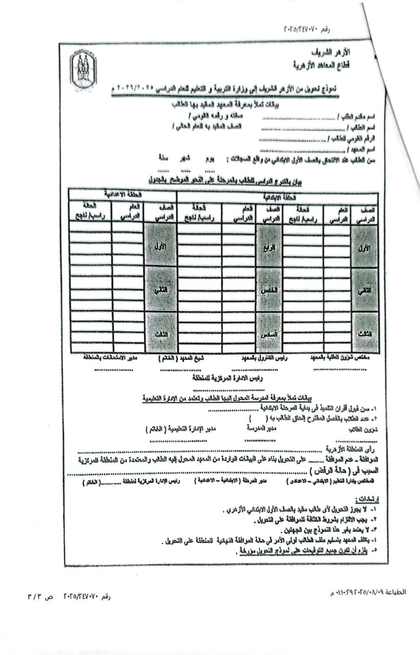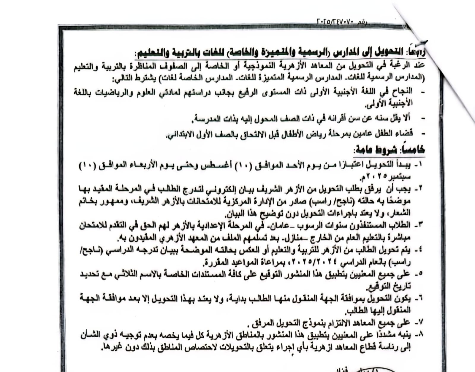 وأوضح المنشور أن التحويل من المعاهد الأزهرية إلى مدارس التربية والتعليم يقتصر على طلاب الصفوف المناظرة للمرحلة الابتدائية والإعدادية، وفقًا للقواعد المحددة، مع مراعاة المواد العلمية والشرعية التي درسها الطالب، وعدم السماح بالتحويل في مرحلة رياض الأطفال والصف الأول الابتدائي. كما نص على شروط خاصة بالتحويل من وإلى المعاهد الأزهرية، منها اجتياز اختبارات تحريرية في القرآن الكريم واللغة العربية والمواد المقررة.